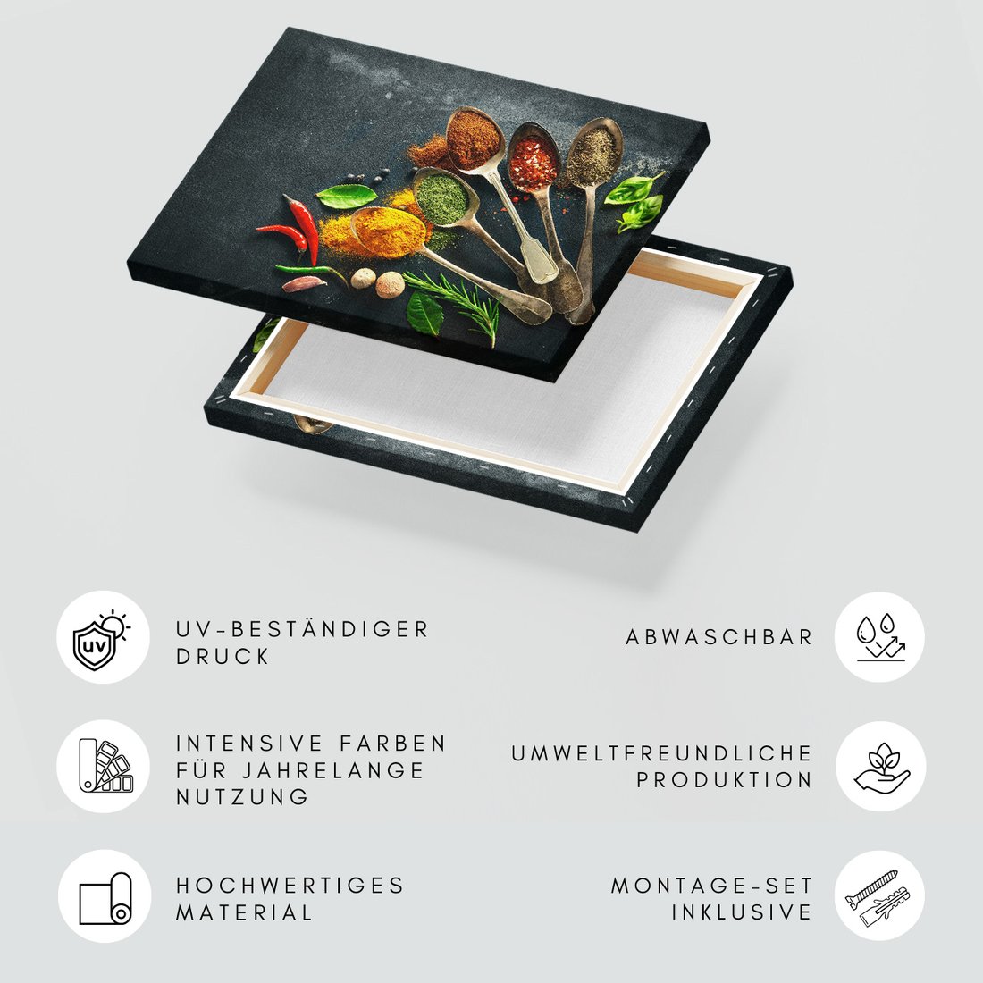 Obraz na płótnie z motywem przyprawy, łyżki, jedzenie to kwintesencja estetyki i trwałości. Dzięki łatwemu montażowi i uniwersalnemu wzornictwu, czyni go idealnym wyborem zarówno do codziennego użytku, jak i na wyrafinowany prezent.