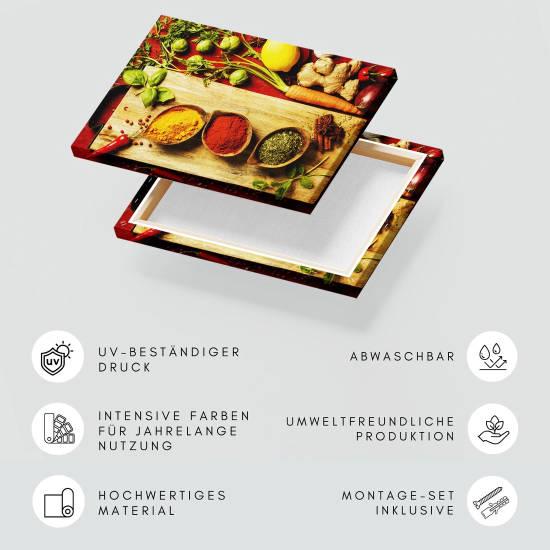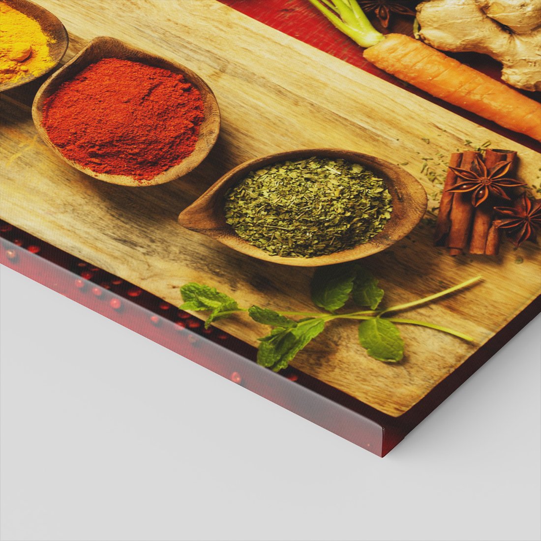 Obraz na płótnie z motywem przyprawy, warzywa, deska to kwintesencja estetyki i trwałości. Dzięki łatwemu montażowi i uniwersalnemu wzornictwu, czyni go idealnym wyborem zarówno do codziennego użytku, jak i na wyrafinowany prezent.