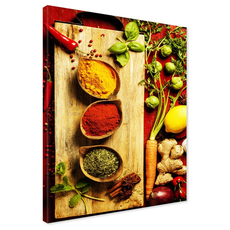 Obraz na płótnie - przyprawy, warzywa, deska