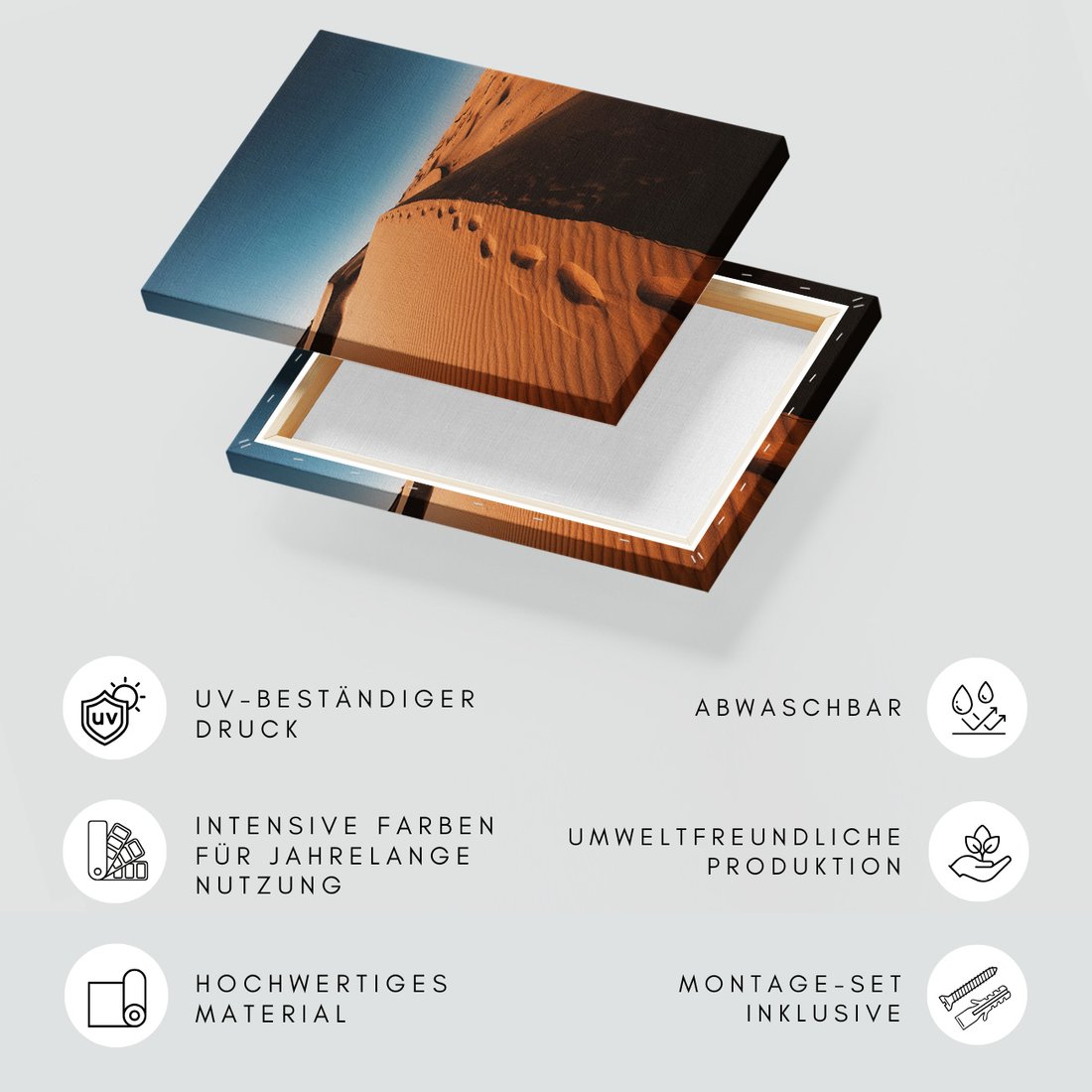 Obraz na płótnie z motywem pustynia, piasek, niebo to kwintesencja estetyki i trwałości. Dzięki łatwemu montażowi i uniwersalnemu wzornictwu, czyni go idealnym wyborem zarówno do codziennego użytku, jak i na wyrafinowany prezent.