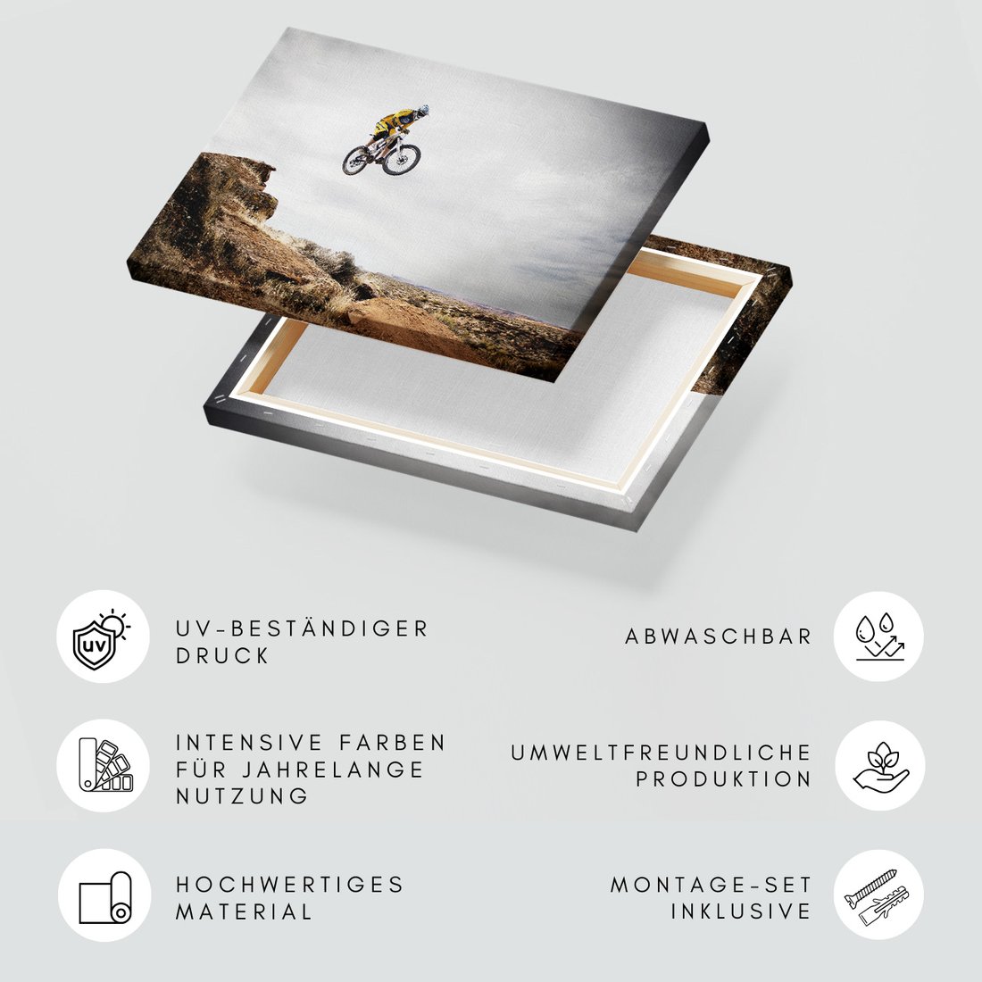 Obraz na płótnie z motywem rowerzysta, skok, sport to kwintesencja estetyki i trwałości. Dzięki łatwemu montażowi i uniwersalnemu wzornictwu, czyni go idealnym wyborem zarówno do codziennego użytku, jak i na wyrafinowany prezent.