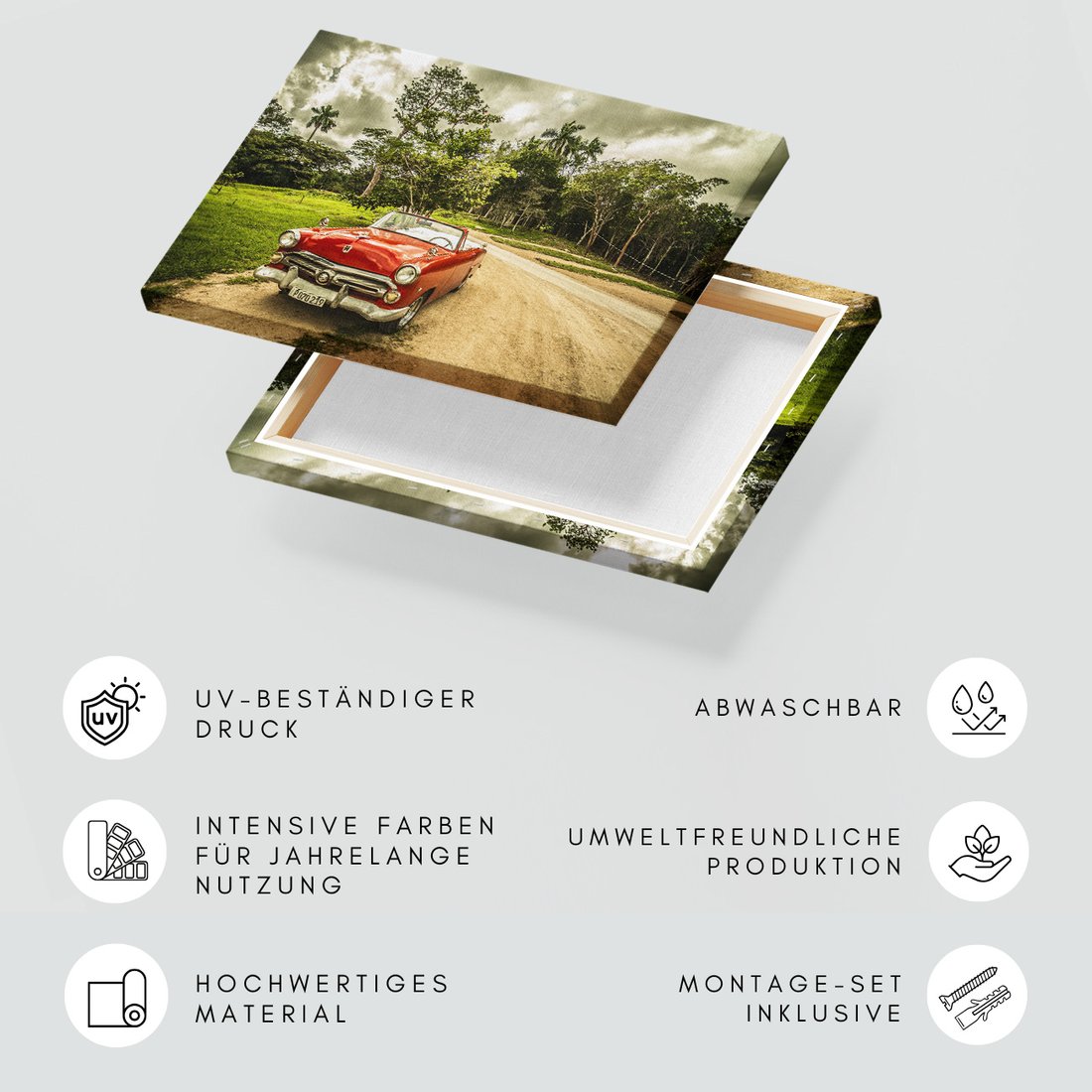 Obraz na płótnie z motywem samochód, vintage, natura to kwintesencja estetyki i trwałości. Dzięki łatwemu montażowi i uniwersalnemu wzornictwu, czyni go idealnym wyborem zarówno do codziennego użytku, jak i na wyrafinowany prezent.
