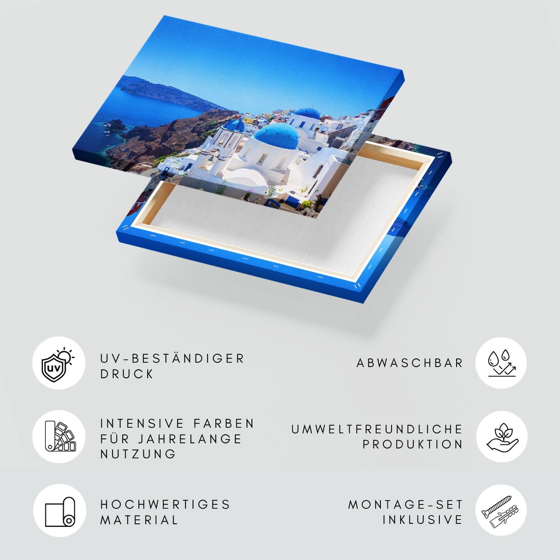 Obraz na płótnie z motywem Santorini, Grecja, morze to kwintesencja estetyki i trwałości. Dzięki łatwemu montażowi i uniwersalnemu wzornictwu, czyni go idealnym wyborem zarówno do codziennego użytku, jak i na wyrafinowany prezent.