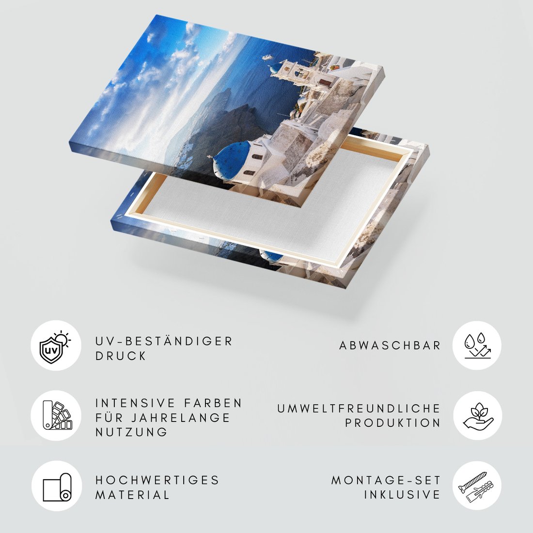 Obraz na płótnie z motywem Santorini, Grecja, morze to kwintesencja estetyki i trwałości. Dzięki łatwemu montażowi i uniwersalnemu wzornictwu, czyni go idealnym wyborem zarówno do codziennego użytku, jak i na wyrafinowany prezent.