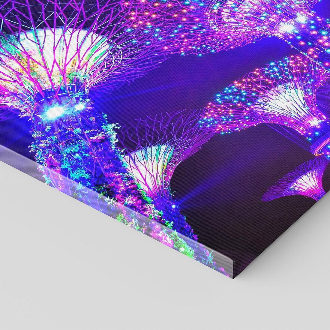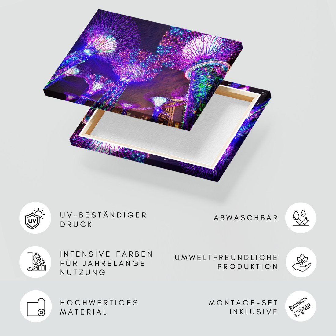 Obraz na płótnie z motywem Singapur, ogrody, noc to kwintesencja estetyki i trwałości. Dzięki łatwemu montażowi i uniwersalnemu wzornictwu, czyni go idealnym wyborem zarówno do codziennego użytku, jak i na wyrafinowany prezent.
