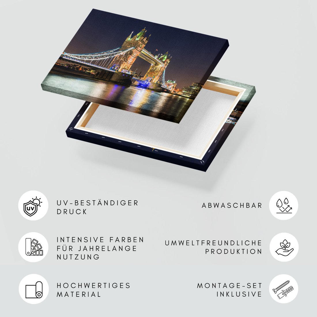 Obraz na płótnie z motywem Tower Bridge, Londyn, noc to kwintesencja estetyki i trwałości. Dzięki łatwemu montażowi i uniwersalnemu wzornictwu, czyni go idealnym wyborem zarówno do codziennego użytku, jak i na wyrafinowany prezent.
