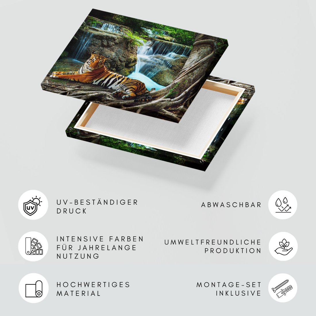 Obraz na płótnie z motywem tygrys, wodospad, dżungla to kwintesencja estetyki i trwałości. Dzięki łatwemu montażowi i uniwersalnemu wzornictwu, czyni go idealnym wyborem zarówno do codziennego użytku, jak i na wyrafinowany prezent.