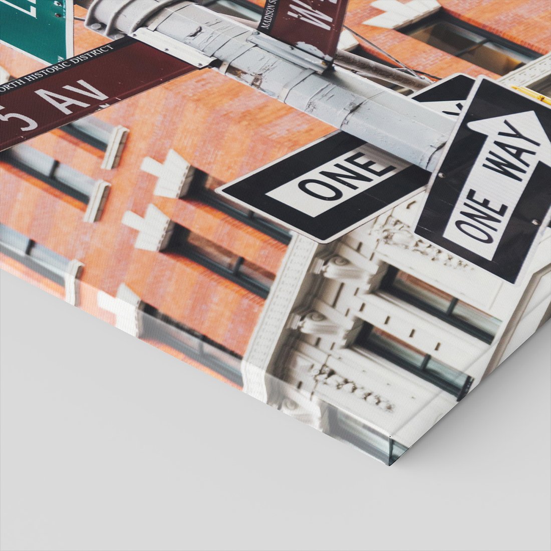 Obraz na płótnie z motywem ulica, znaki, miasto to kwintesencja estetyki i trwałości. Dzięki łatwemu montażowi i uniwersalnemu wzornictwu, czyni go idealnym wyborem zarówno do codziennego użytku, jak i na wyrafinowany prezent.