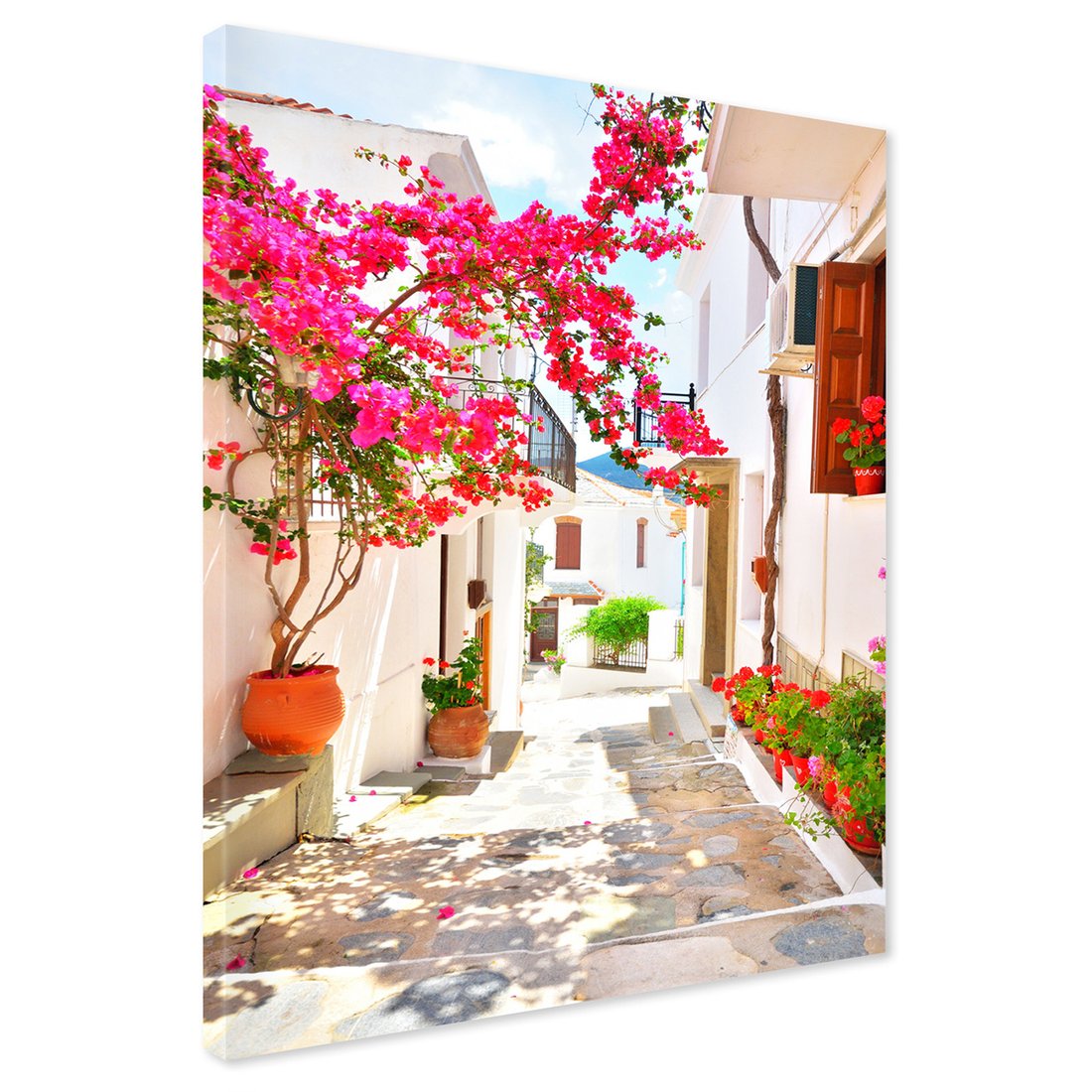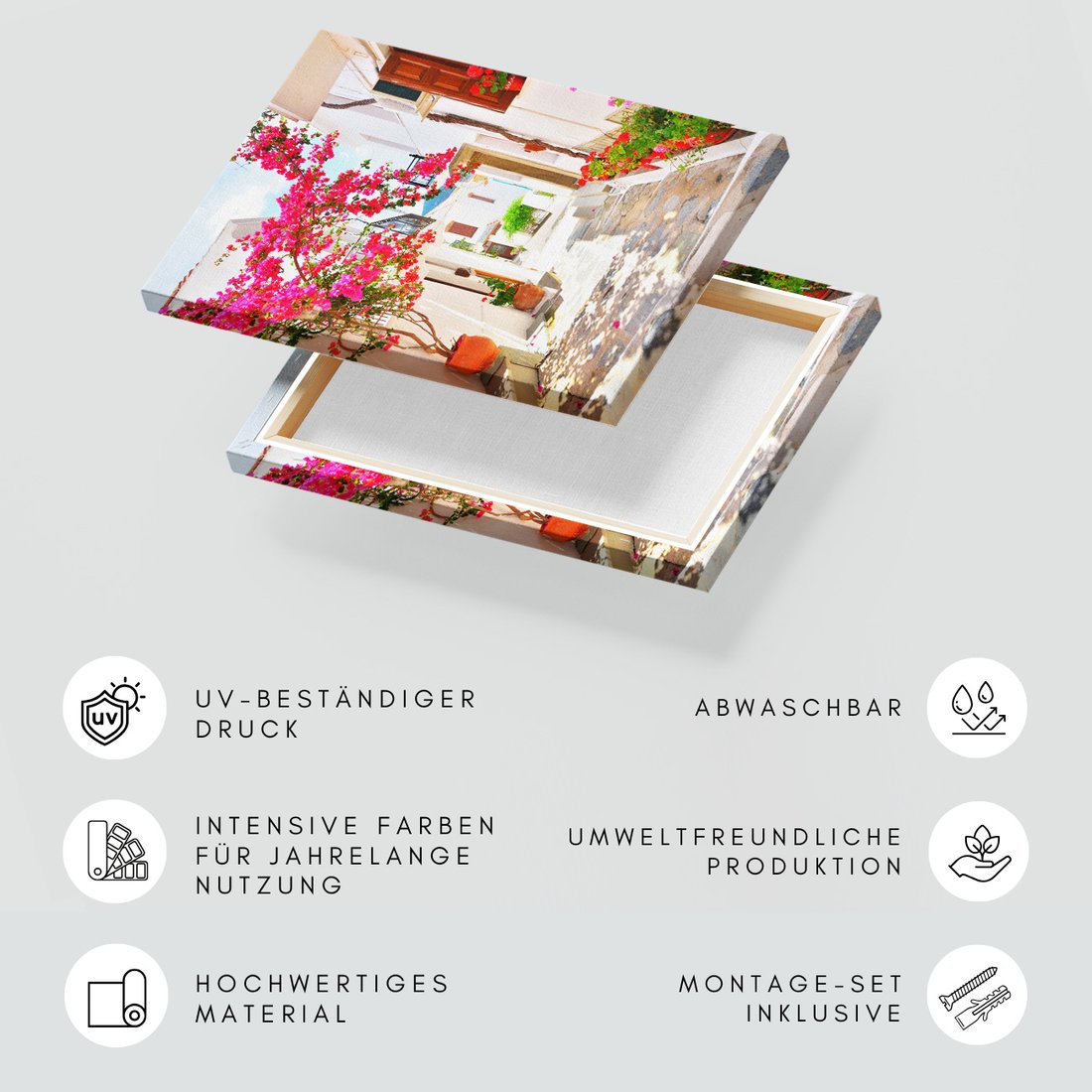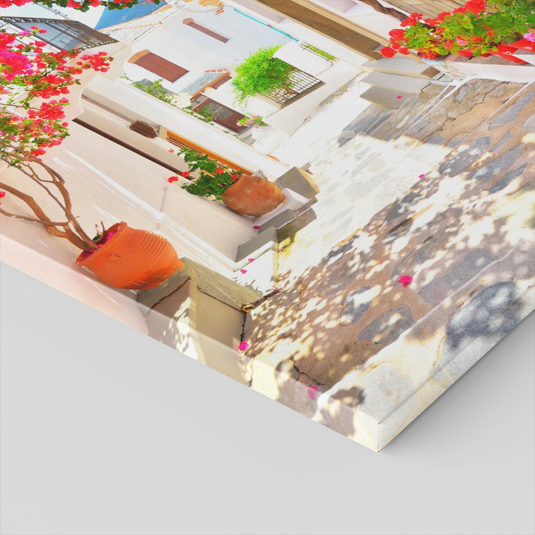 Obraz na płótnie z motywem uliczka, kwiaty, białe budynki to kwintesencja estetyki i trwałości. Dzięki łatwemu montażowi i uniwersalnemu wzornictwu, czyni go idealnym wyborem zarówno do codziennego użytku, jak i na wyrafinowany prezent.