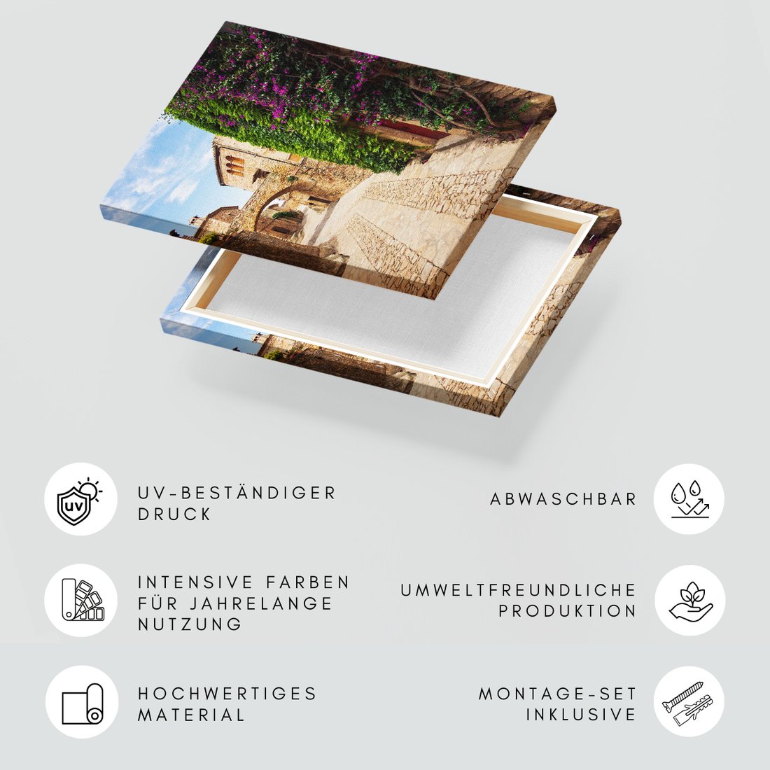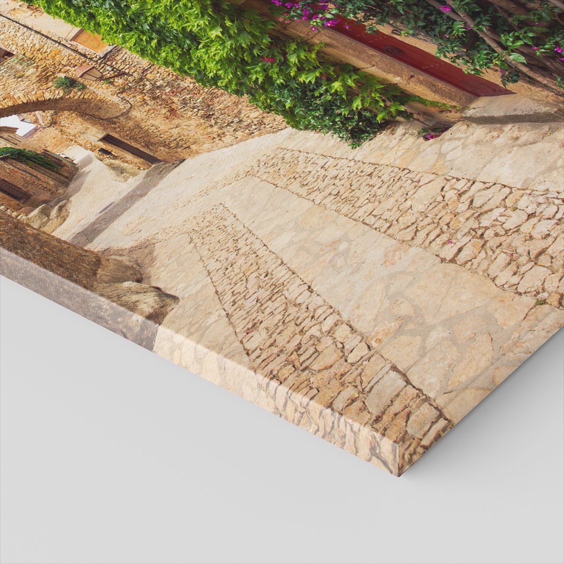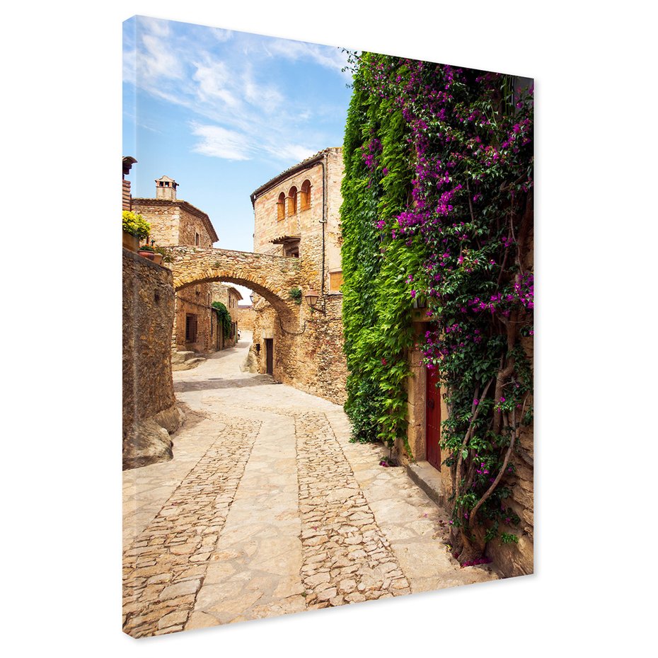 Obraz na płótnie z motywem uliczka, kwiaty, kamień to kwintesencja estetyki i trwałości. Dzięki łatwemu montażowi i uniwersalnemu wzornictwu, czyni go idealnym wyborem zarówno do codziennego użytku, jak i na wyrafinowany prezent.