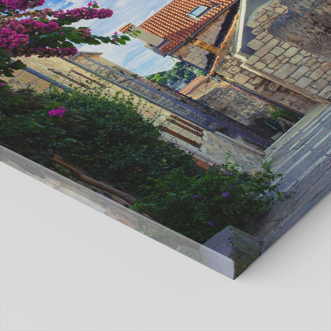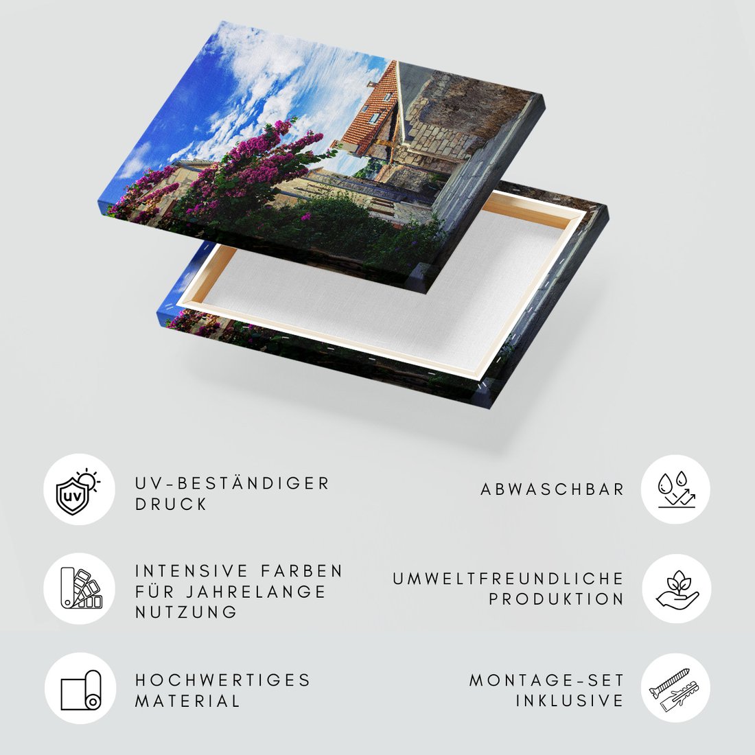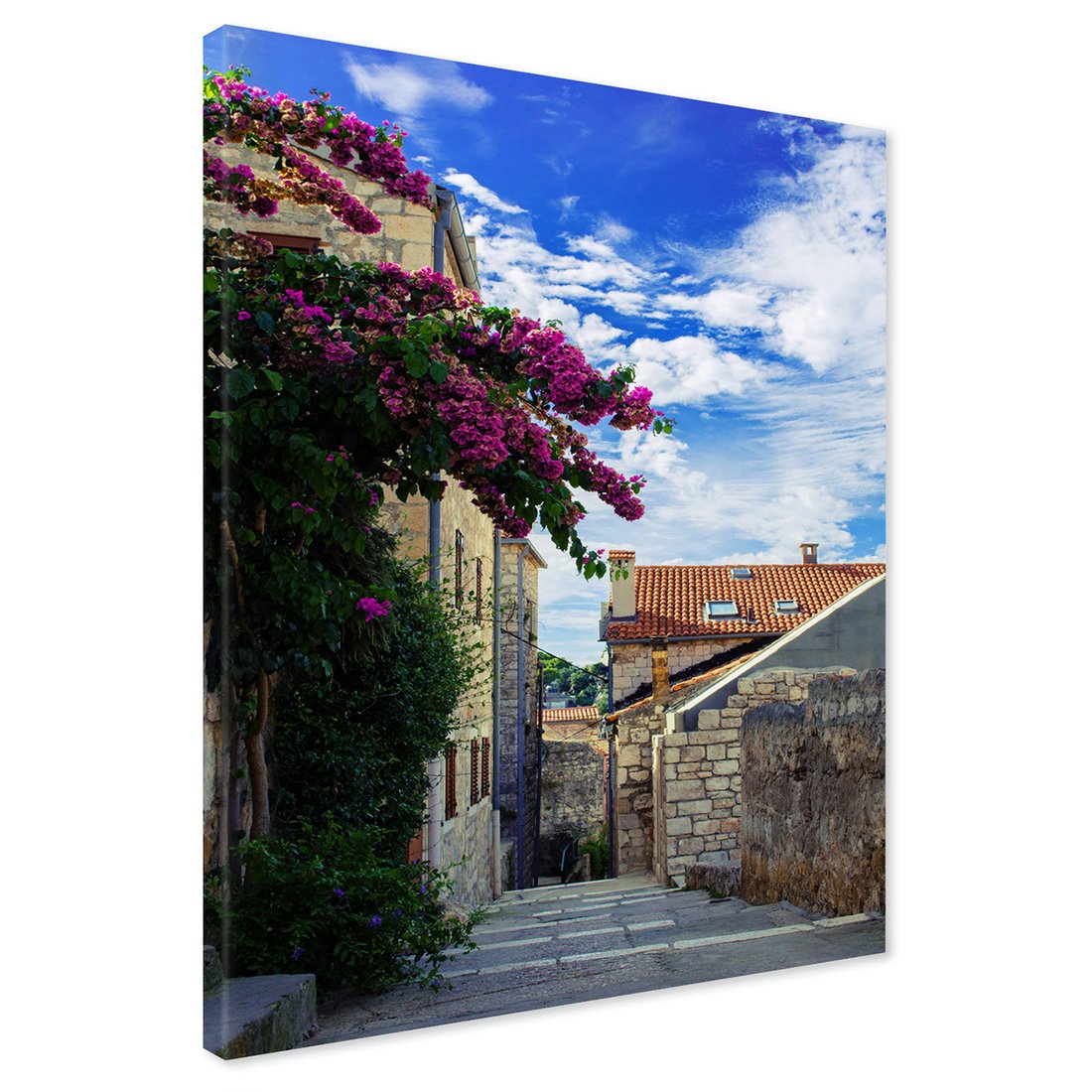 Obraz na płótnie z motywem uliczka, kwiaty, niebo to kwintesencja estetyki i trwałości. Dzięki łatwemu montażowi i uniwersalnemu wzornictwu, czyni go idealnym wyborem zarówno do codziennego użytku, jak i na wyrafinowany prezent.