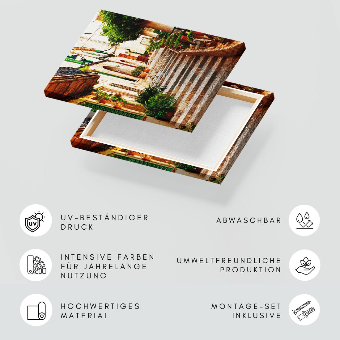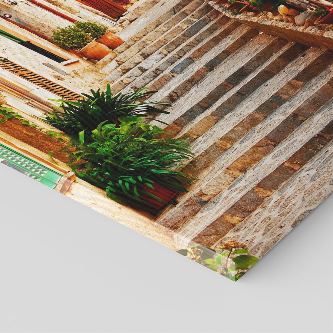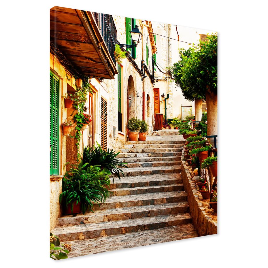Obraz na płótnie z motywem uliczka, schody, kwiaty to kwintesencja estetyki i trwałości. Dzięki łatwemu montażowi i uniwersalnemu wzornictwu, czyni go idealnym wyborem zarówno do codziennego użytku, jak i na wyrafinowany prezent.