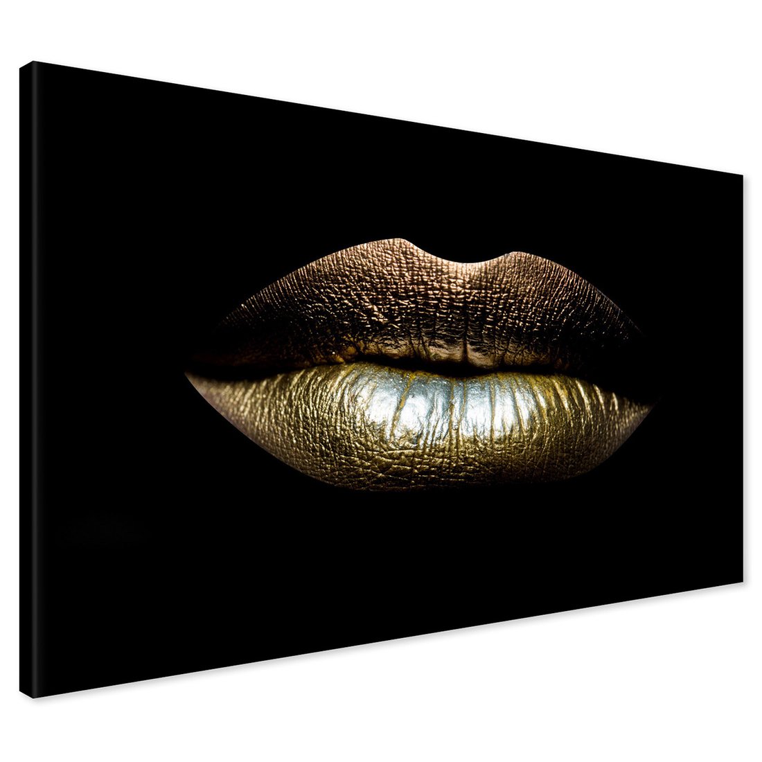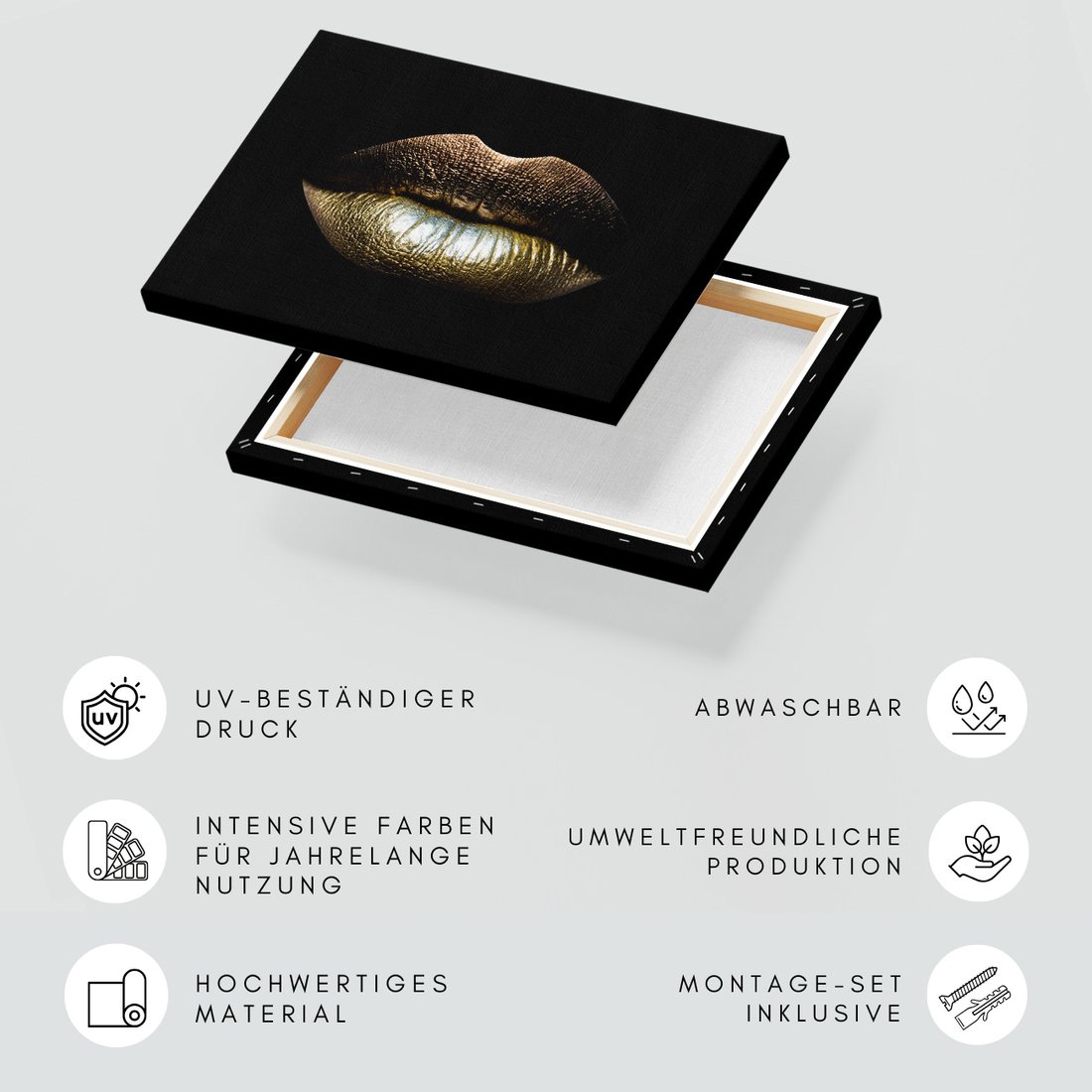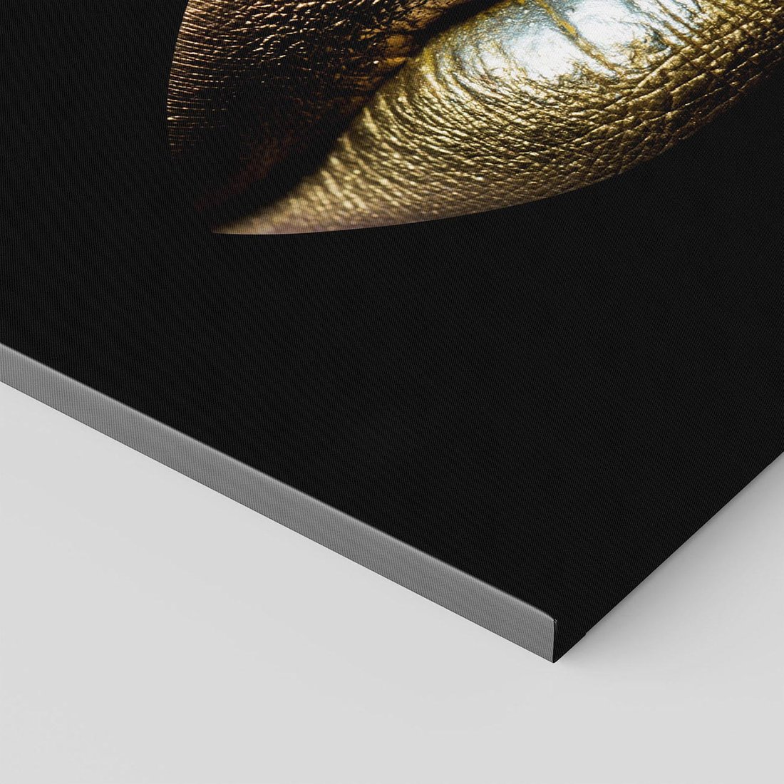 Obraz na płótnie z motywem usta, złoto, blask to kwintesencja estetyki i trwałości. Dzięki łatwemu montażowi i uniwersalnemu wzornictwu, czyni go idealnym wyborem zarówno do codziennego użytku, jak i na wyrafinowany prezent.