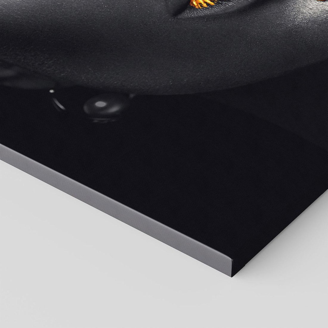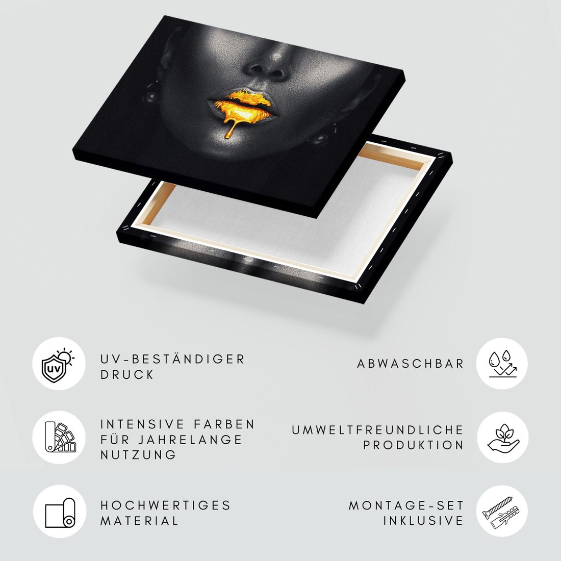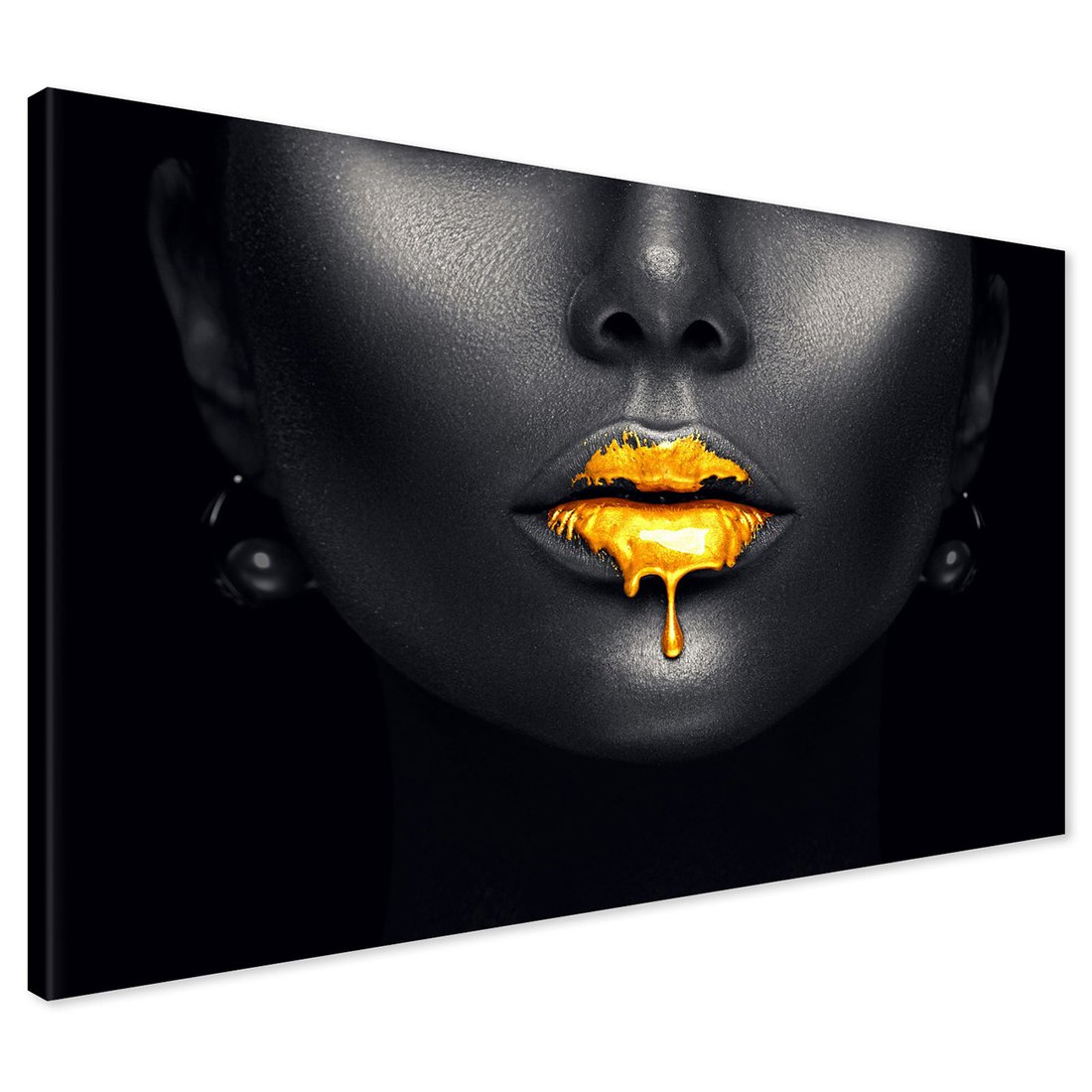Obraz na płótnie z motywem usta, złoto, czarny to kwintesencja estetyki i trwałości. Dzięki łatwemu montażowi i uniwersalnemu wzornictwu, czyni go idealnym wyborem zarówno do codziennego użytku, jak i na wyrafinowany prezent.