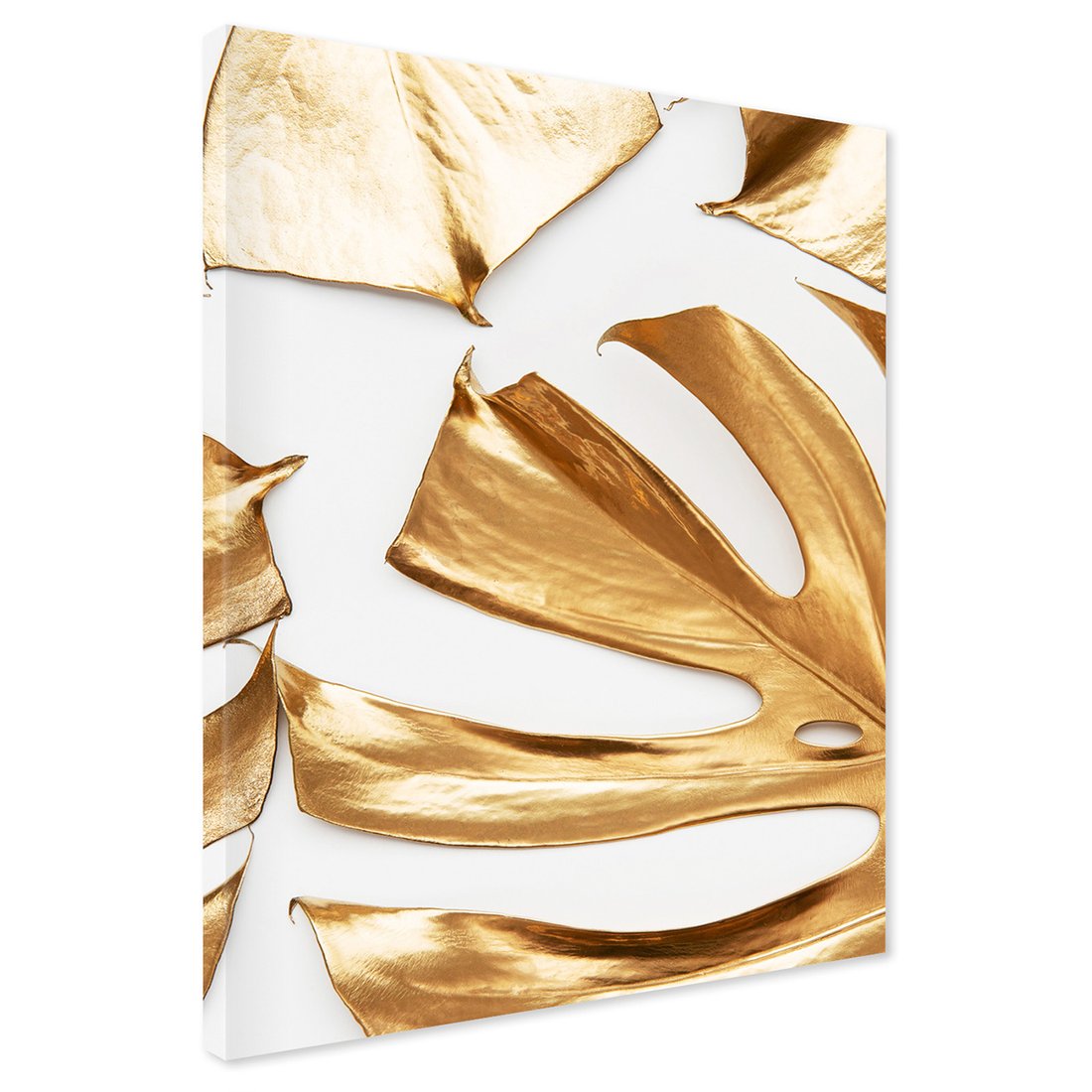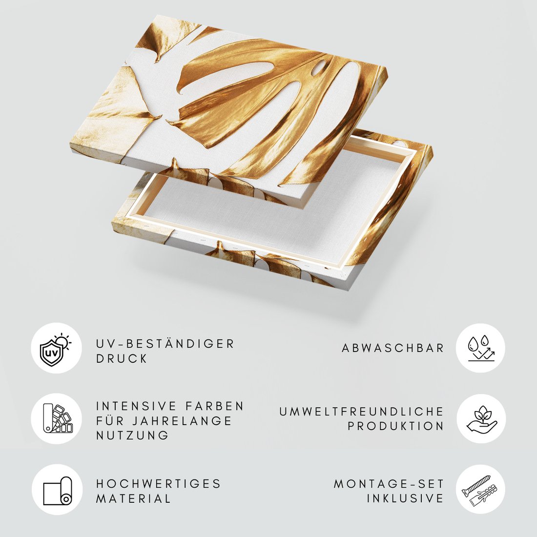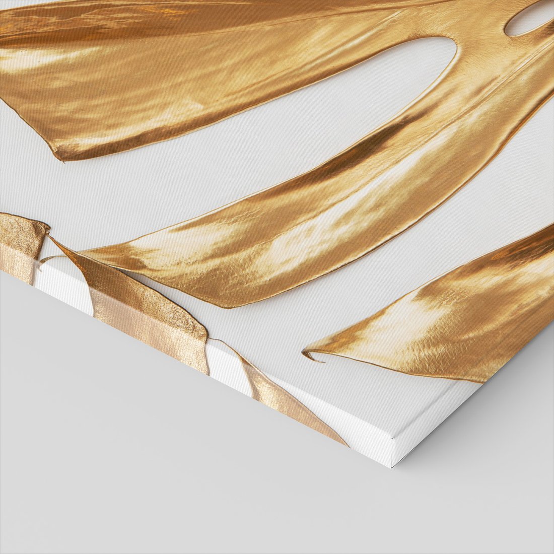 Obraz na płótnie z motywem złoto, liście, monstera to kwintesencja estetyki i trwałości. Dzięki łatwemu montażowi i uniwersalnemu wzornictwu, czyni go idealnym wyborem zarówno do codziennego użytku, jak i na wyrafinowany prezent.