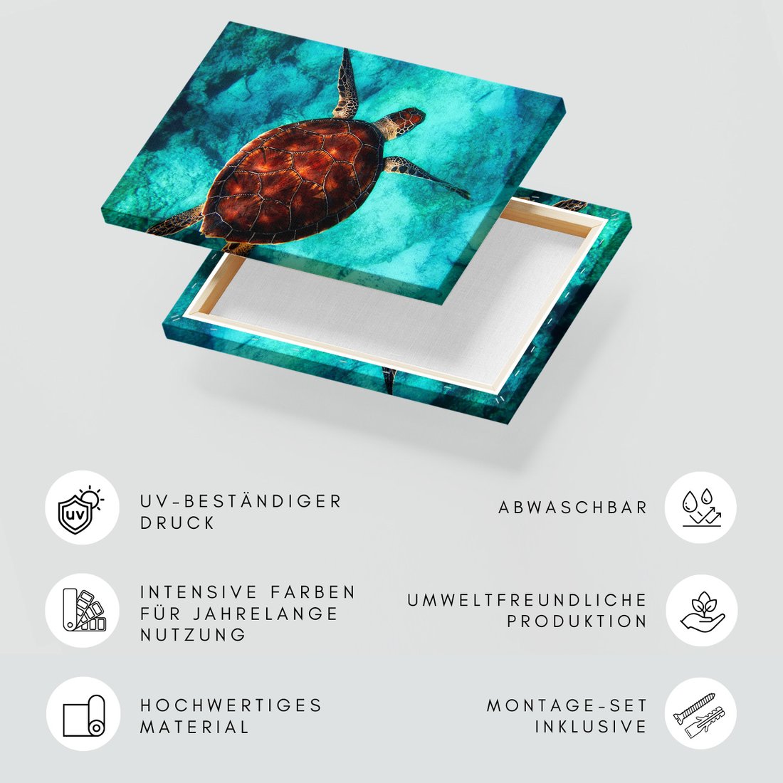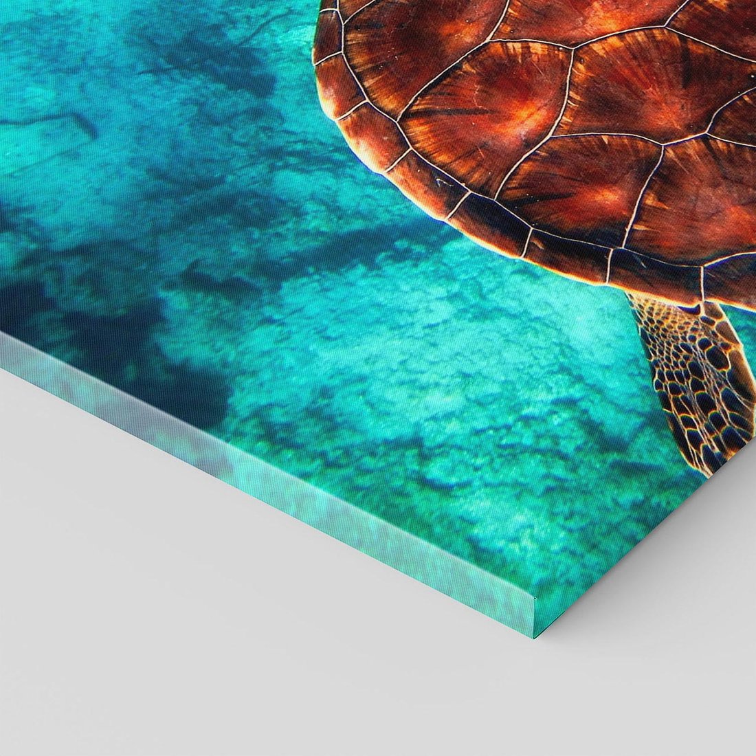 Obraz na płótnie z motywem żółw morski, pod wodą, ocean to kwintesencja estetyki i trwałości. Dzięki łatwemu montażowi i uniwersalnemu wzornictwu, czyni go idealnym wyborem zarówno do codziennego użytku, jak i na wyrafinowany prezent.
