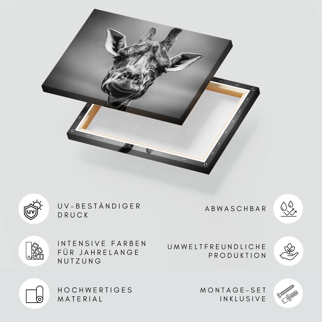 Obraz na płótnie z motywem żyrafa, portret, Afryka to kwintesencja estetyki i trwałości. Dzięki łatwemu montażowi i uniwersalnemu wzornictwu, czyni go idealnym wyborem zarówno do codziennego użytku, jak i na wyrafinowany prezent.