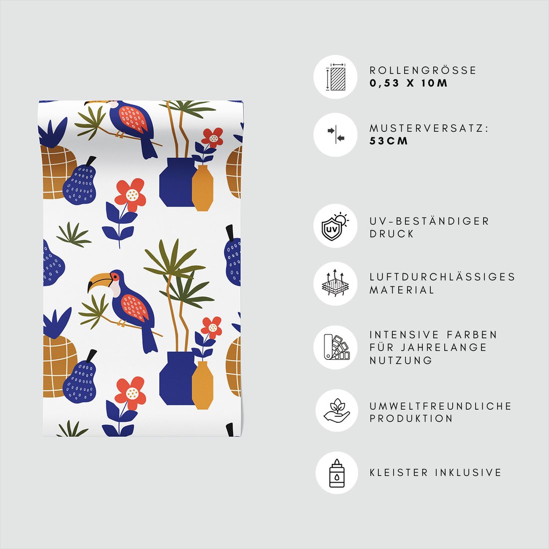 Odkryj piękno i funkcjonalność tapety z motywem ananasy, kwiaty, tukan. To połączenie wyjątkowego wzornictwa z łatwością aplikacji, doskonałe do każdego pomieszczenia.
