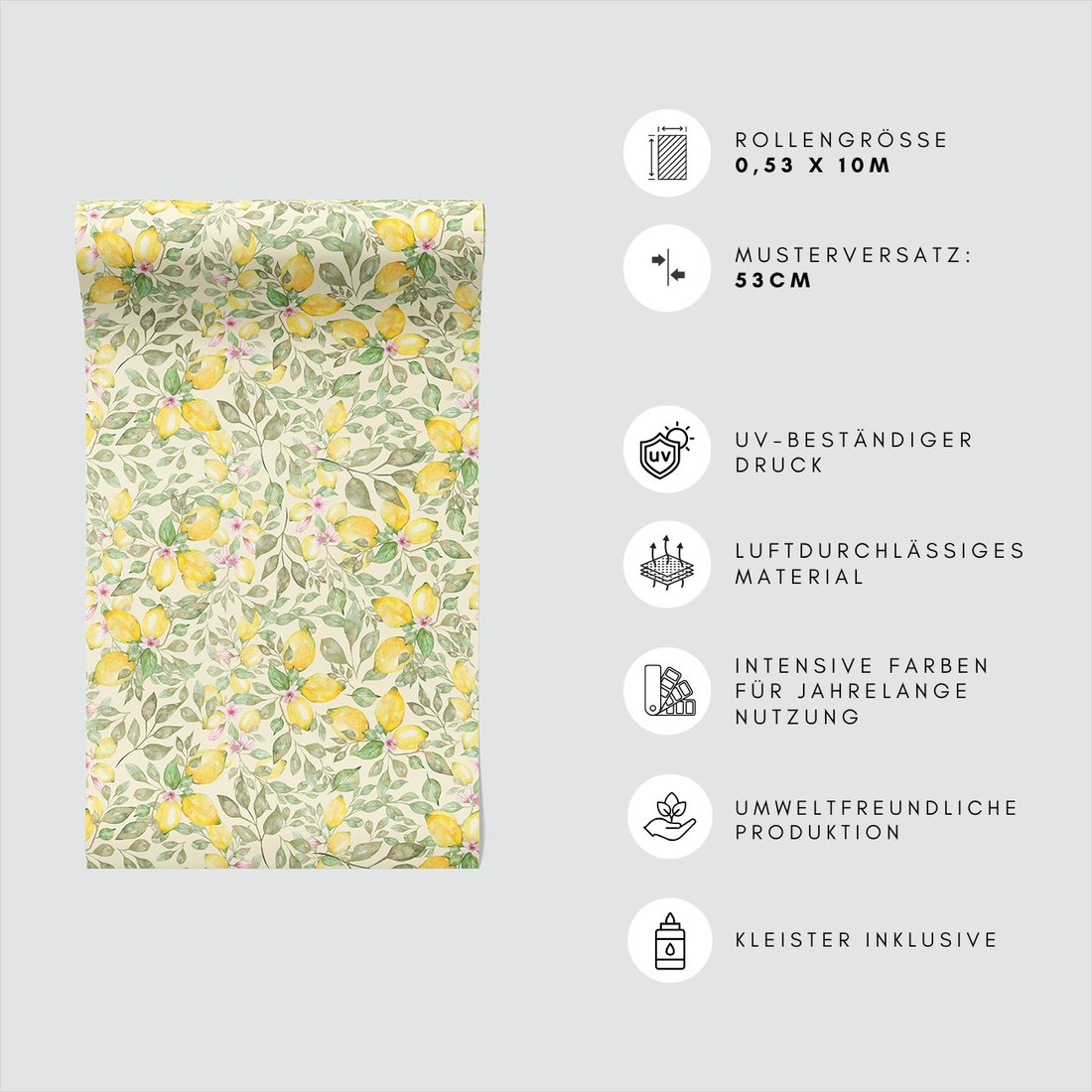 Odkryj piękno i funkcjonalność tapety z motywem cytryny, liście, kwiaty. To połączenie wyjątkowego wzornictwa z łatwością aplikacji, doskonałe do każdego pomieszczenia.