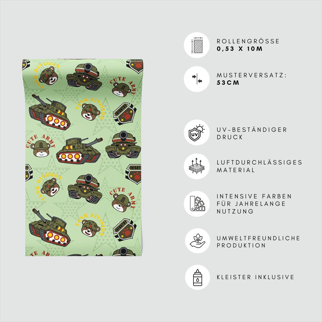 Odkryj piękno i funkcjonalność tapety z motywem dziecięca, czołgi, misie, gwiazdy. To połączenie wyjątkowego wzornictwa z łatwością aplikacji, doskonałe do każdego pomieszczenia.