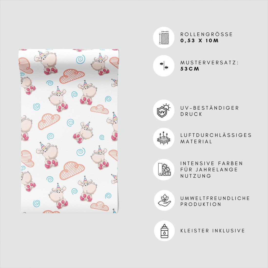 Odkryj piękno i funkcjonalność tapety z motywem dziecięca, hipopotam, chmura, spirala. To połączenie wyjątkowego wzornictwa z łatwością aplikacji, doskonałe do każdego pomieszczenia.