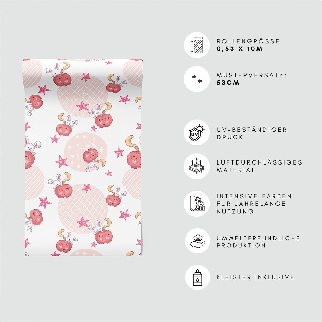 Odkryj piękno i funkcjonalność tapety z motywem dziecięca, jabłko, królik, gwiazda. To połączenie wyjątkowego wzornictwa z łatwością aplikacji, doskonałe do każdego pomieszczenia.