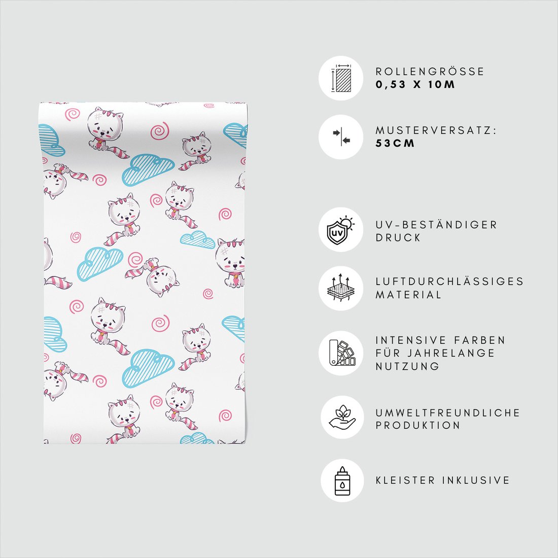 Odkryj piękno i funkcjonalność tapety z motywem dziecięca, koty, chmury, spirale. To połączenie wyjątkowego wzornictwa z łatwością aplikacji, doskonałe do każdego pomieszczenia.