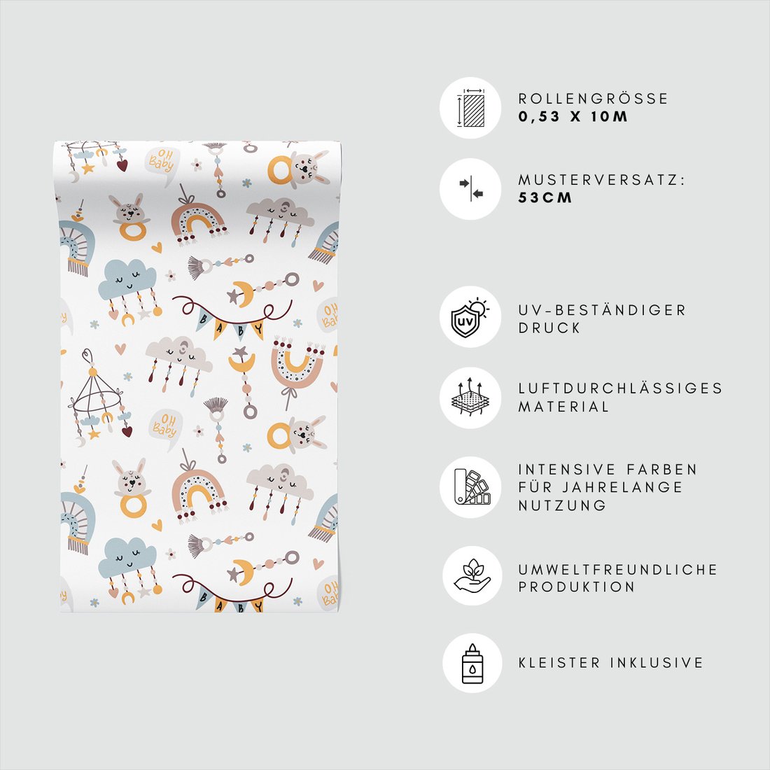 Odkryj piękno i funkcjonalność tapety z motywem dziecięca, królik, chmura, tęcza. To połączenie wyjątkowego wzornictwa z łatwością aplikacji, doskonałe do każdego pomieszczenia.