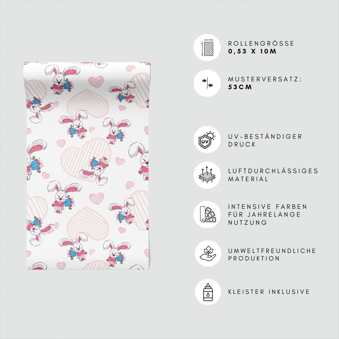 Odkryj piękno i funkcjonalność tapety z motywem dziecięca, królik, serca, bukiet. To połączenie wyjątkowego wzornictwa z łatwością aplikacji, doskonałe do każdego pomieszczenia.