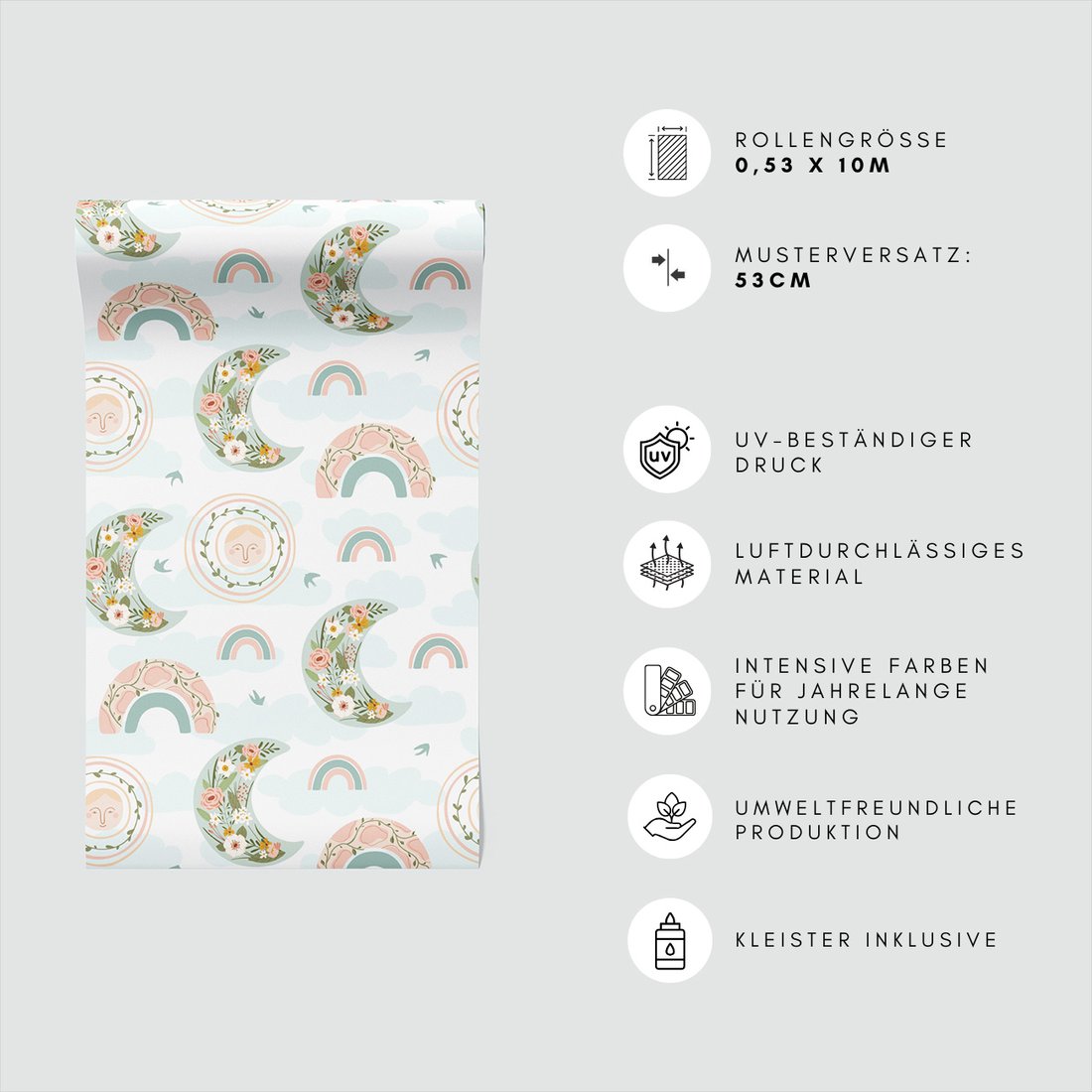 Odkryj piękno i funkcjonalność tapety z motywem dziecięca, księżyc, tęcza, kwiaty. To połączenie wyjątkowego wzornictwa z łatwością aplikacji, doskonałe do każdego pomieszczenia.