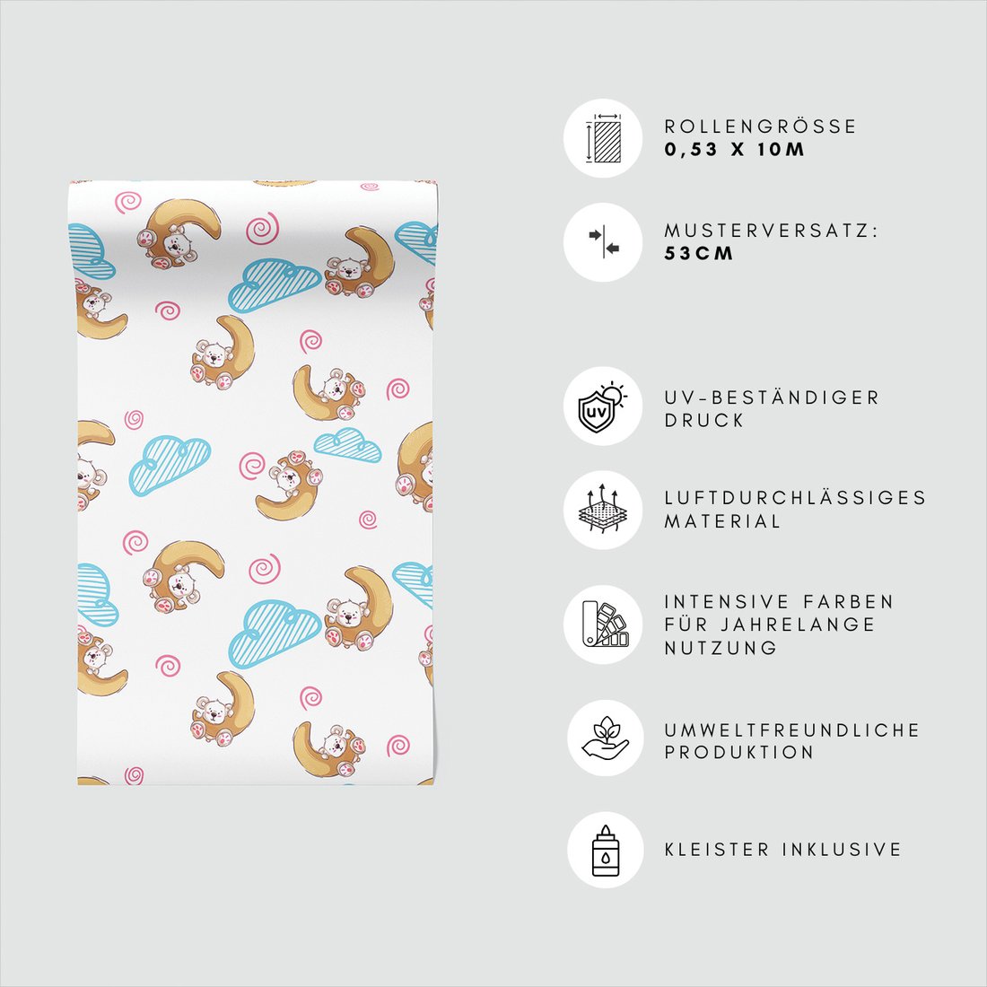 Odkryj piękno i funkcjonalność tapety z motywem dziecięca, miś, księżyc, chmura. To połączenie wyjątkowego wzornictwa z łatwością aplikacji, doskonałe do każdego pomieszczenia.