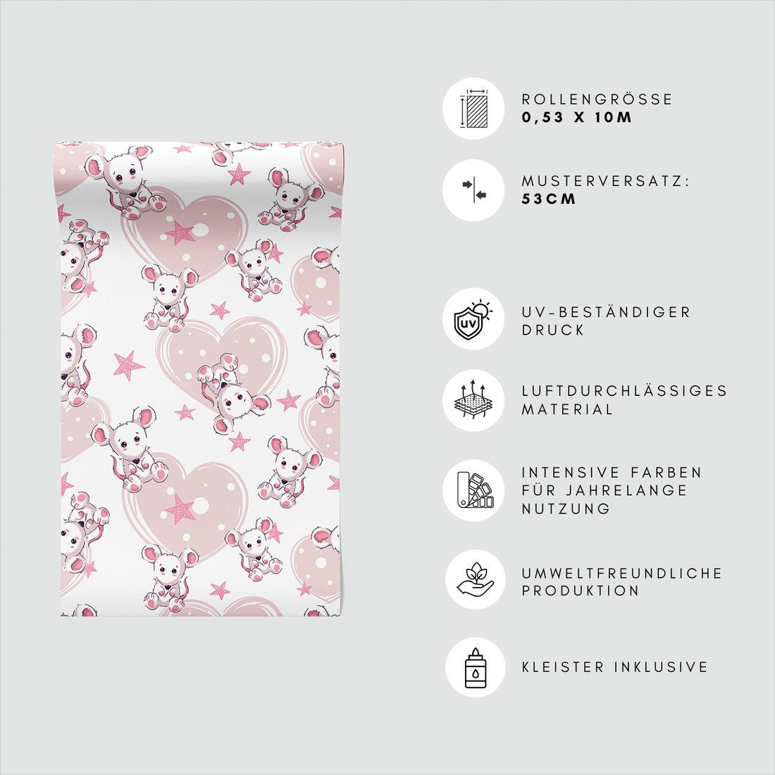 Odkryj piękno i funkcjonalność tapety z motywem dziecięca, mysz, serca, gwiazdy. To połączenie wyjątkowego wzornictwa z łatwością aplikacji, doskonałe do każdego pomieszczenia.