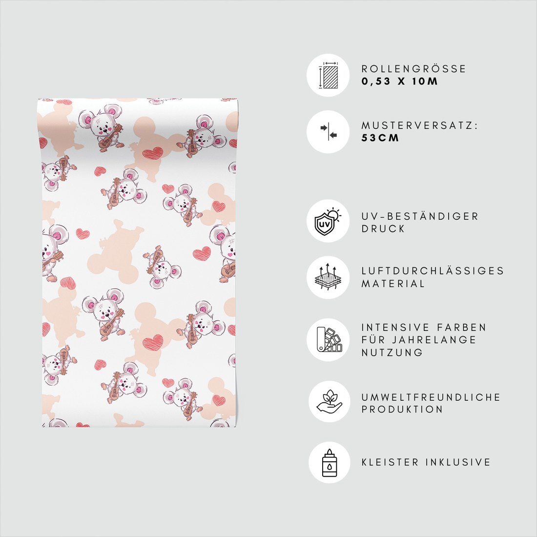Odkryj piękno i funkcjonalność tapety z motywem dziecięca, myszka, gitara, serce. To połączenie wyjątkowego wzornictwa z łatwością aplikacji, doskonałe do każdego pomieszczenia.