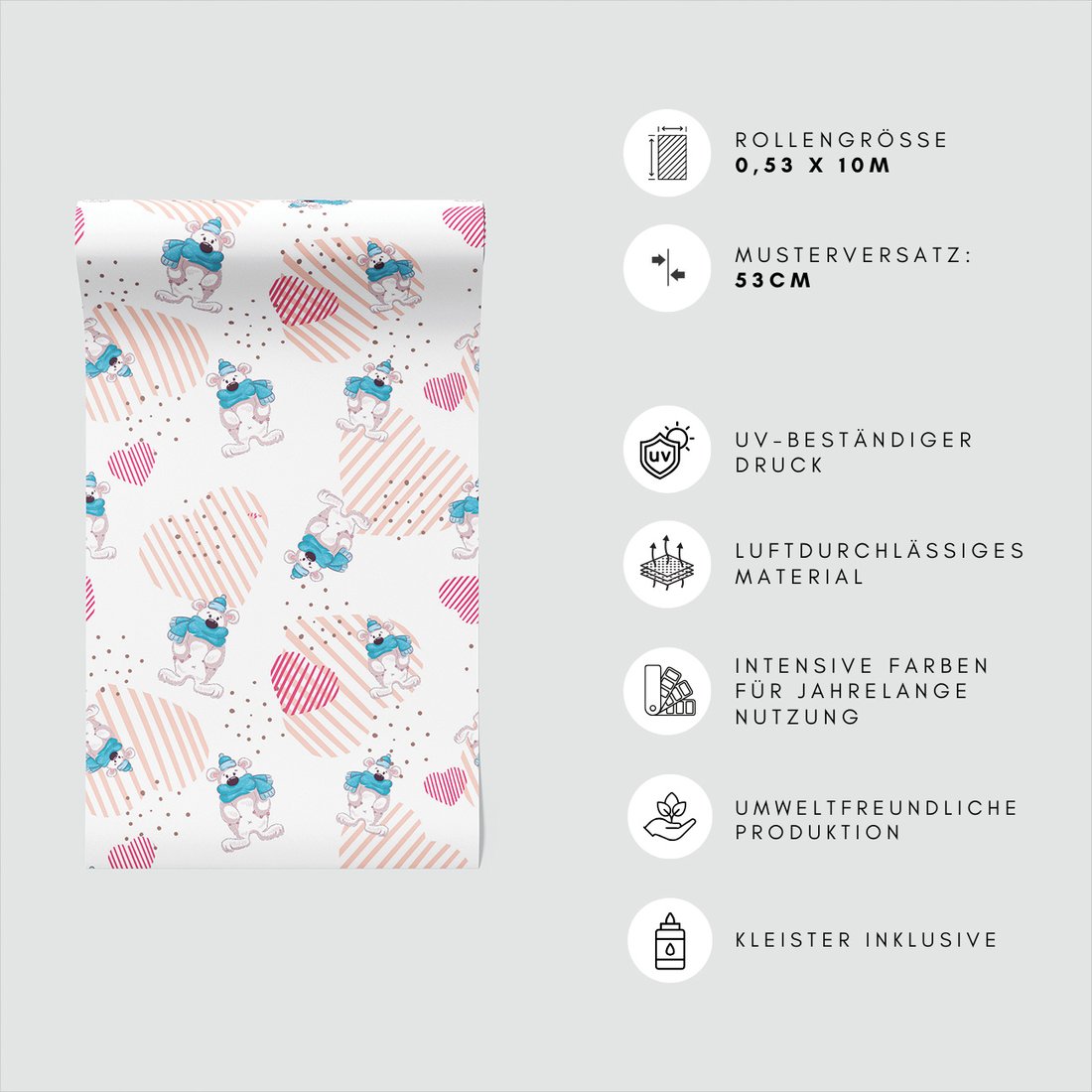 Odkryj piękno i funkcjonalność tapety z motywem dziecięca, niedźwiedź, szalik, serce. To połączenie wyjątkowego wzornictwa z łatwością aplikacji, doskonałe do każdego pomieszczenia.