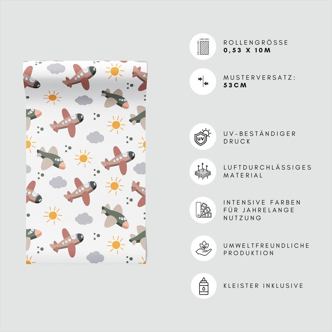 Tapeta - dziecięca, samoloty, słońca, chmury