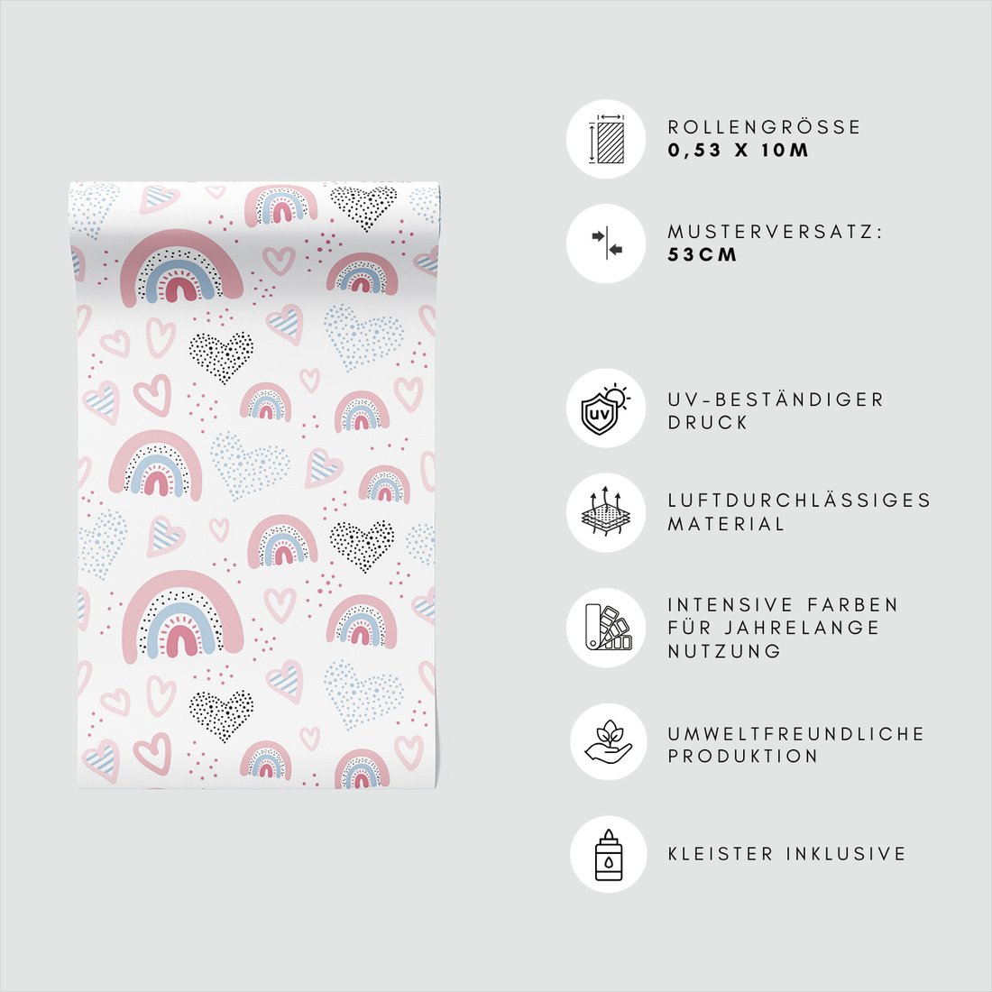 Odkryj piękno i funkcjonalność tapety z motywem dziecięca, serca, tęcze, kropki. To połączenie wyjątkowego wzornictwa z łatwością aplikacji, doskonałe do każdego pomieszczenia.