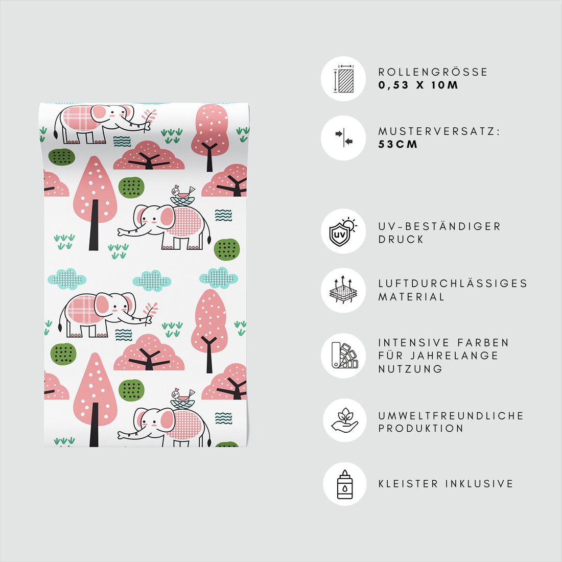 Odkryj piękno i funkcjonalność tapety z motywem dziecięca, słoń, drzewa, ptak. To połączenie wyjątkowego wzornictwa z łatwością aplikacji, doskonałe do każdego pomieszczenia.