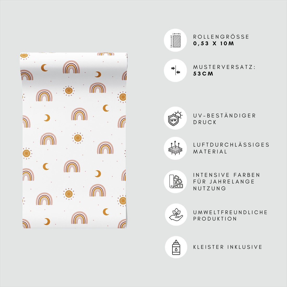 Odkryj piękno i funkcjonalność tapety z motywem dziecięca, tęcza, słońce, księżyc. To połączenie wyjątkowego wzornictwa z łatwością aplikacji, doskonałe do każdego pomieszczenia.