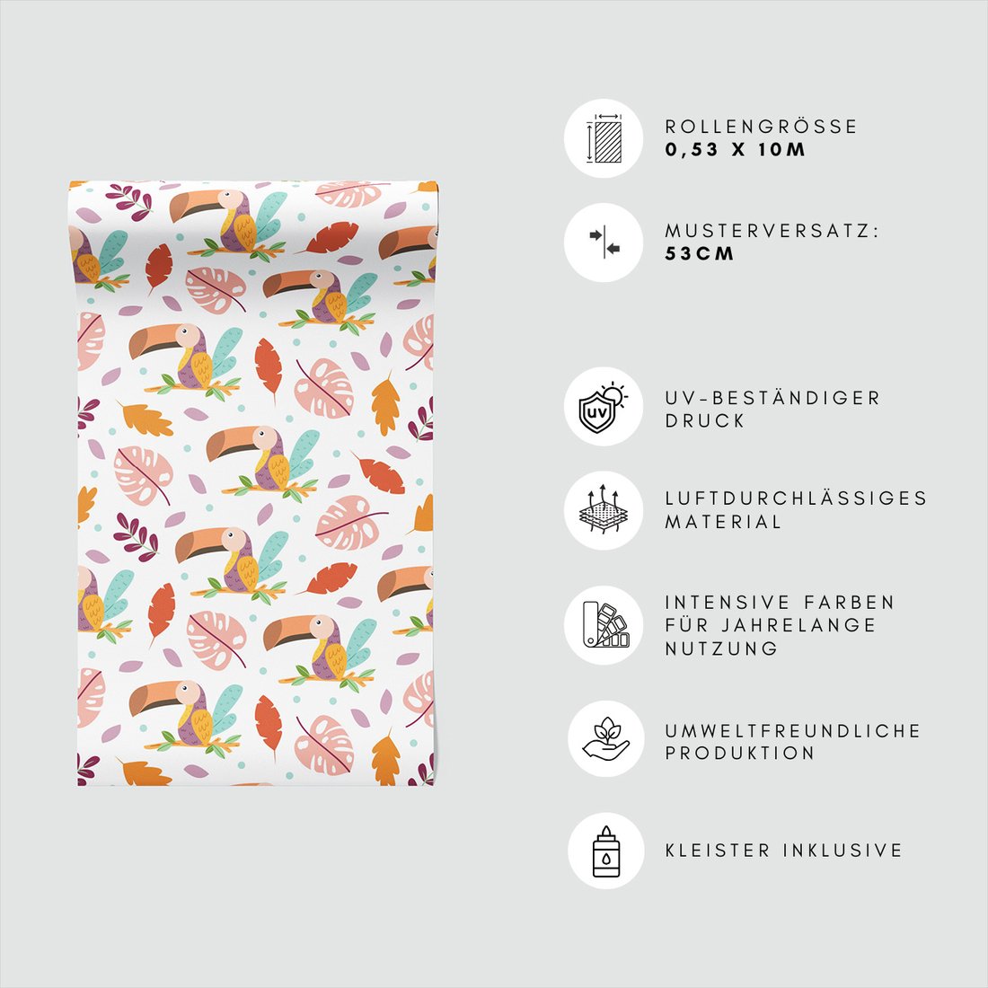 Odkryj piękno i funkcjonalność tapety z motywem dziecięca, tukany, liście, gałąź. To połączenie wyjątkowego wzornictwa z łatwością aplikacji, doskonałe do każdego pomieszczenia.