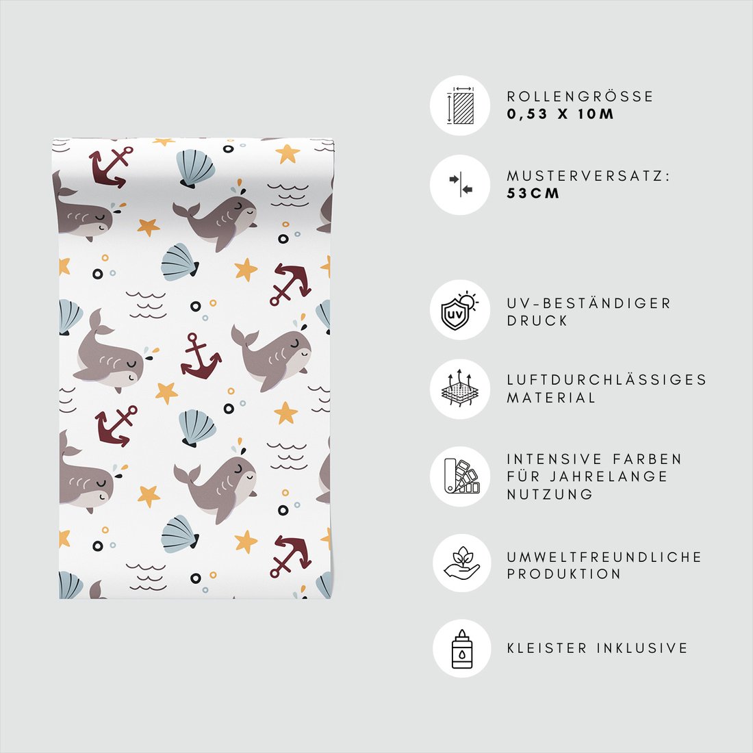 Odkryj piękno i funkcjonalność tapety z motywem dziecięca, wieloryb, kotwica, muszla. To połączenie wyjątkowego wzornictwa z łatwością aplikacji, doskonałe do każdego pomieszczenia.