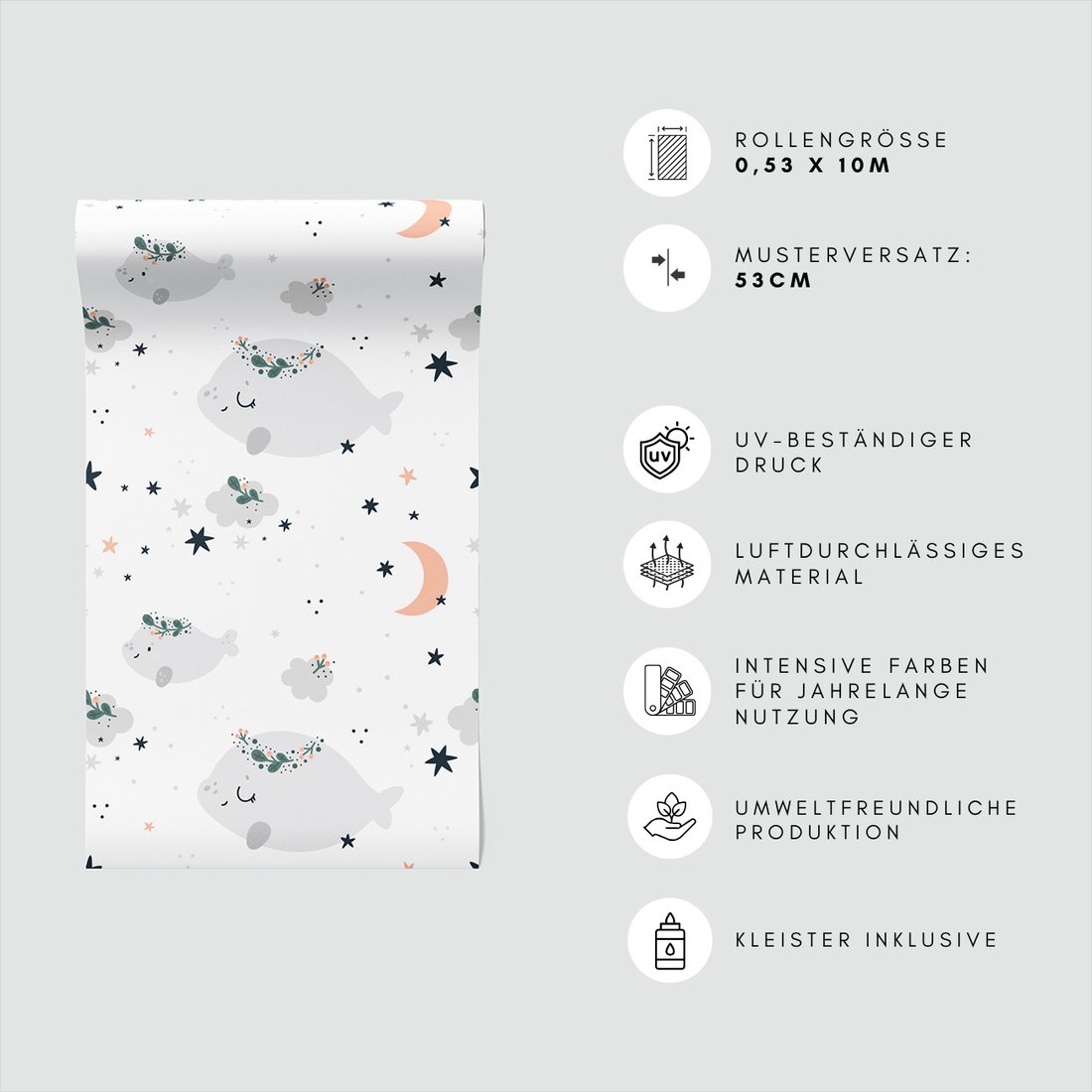 Odkryj piękno i funkcjonalność tapety z motywem dziecięca, wieloryby, gwiazdy, księżyc. To połączenie wyjątkowego wzornictwa z łatwością aplikacji, doskonałe do każdego pomieszczenia.