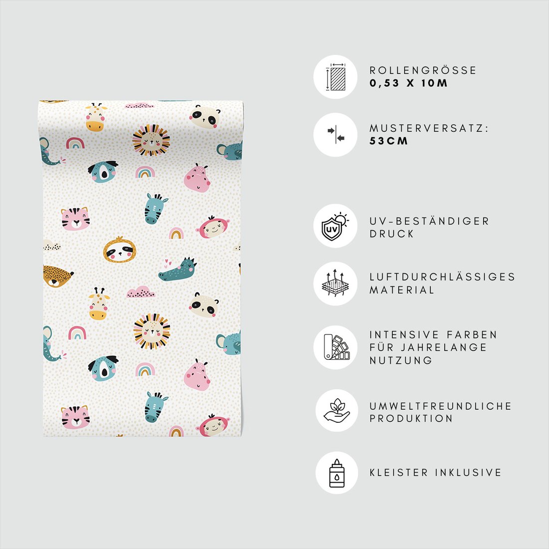 Odkryj piękno i funkcjonalność tapety z motywem dziecięca, zwierzęta, tęcza, wzór. To połączenie wyjątkowego wzornictwa z łatwością aplikacji, doskonałe do każdego pomieszczenia.