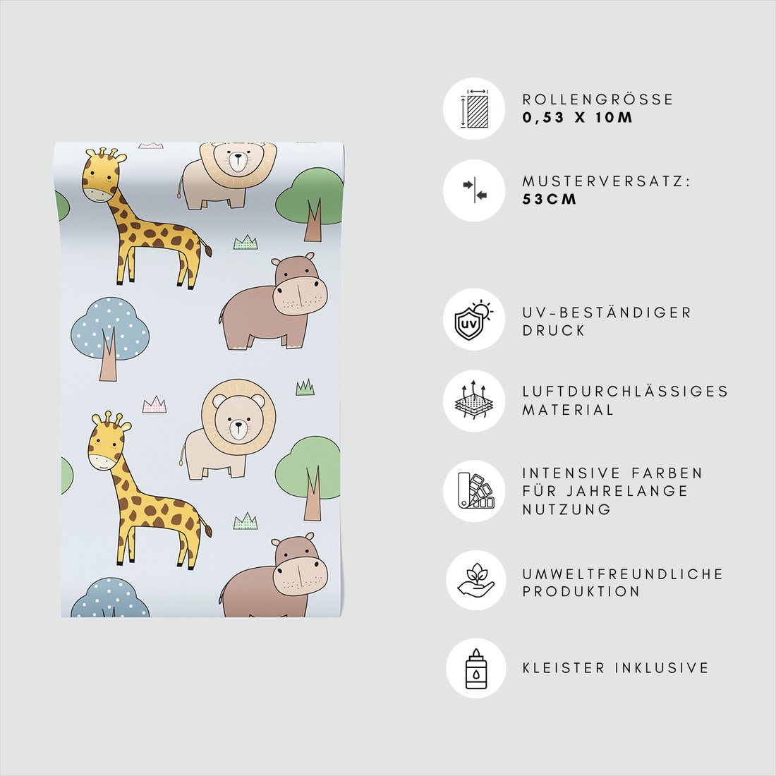 Odkryj piękno i funkcjonalność tapety z motywem dziecięca, żyrafa, lew, hipopotam. To połączenie wyjątkowego wzornictwa z łatwością aplikacji, doskonałe do każdego pomieszczenia.