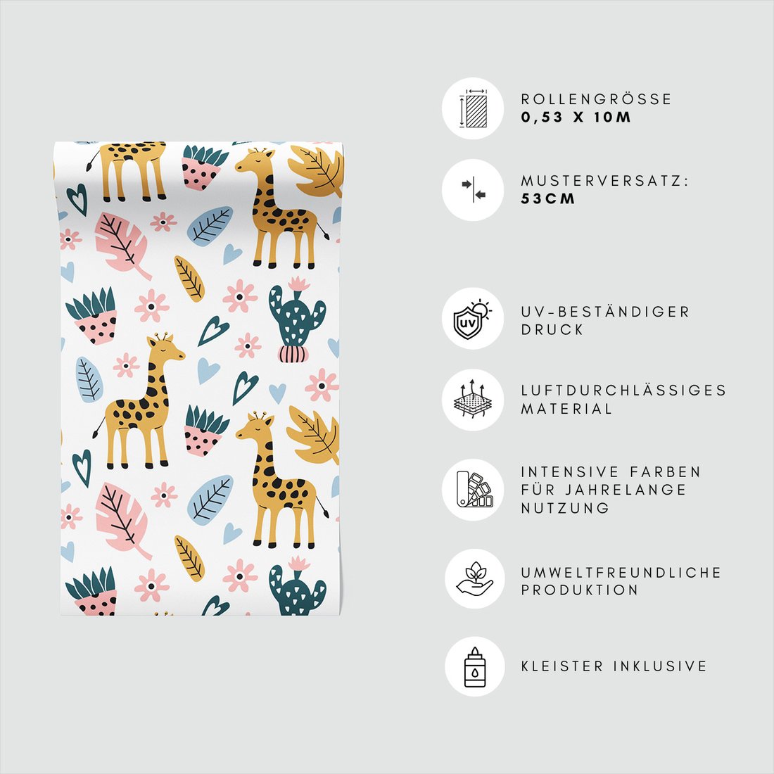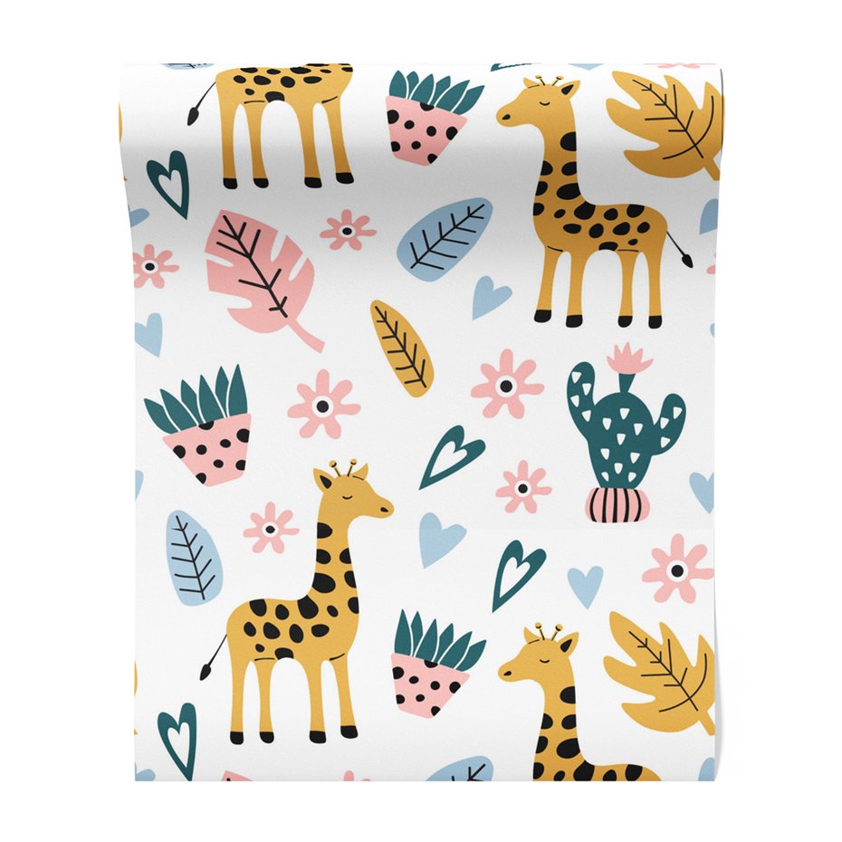 Odkryj piękno i funkcjonalność tapety z motywem dziecięca, żyrafa, liście, kwiaty. To połączenie wyjątkowego wzornictwa z łatwością aplikacji, doskonałe do każdego pomieszczenia.