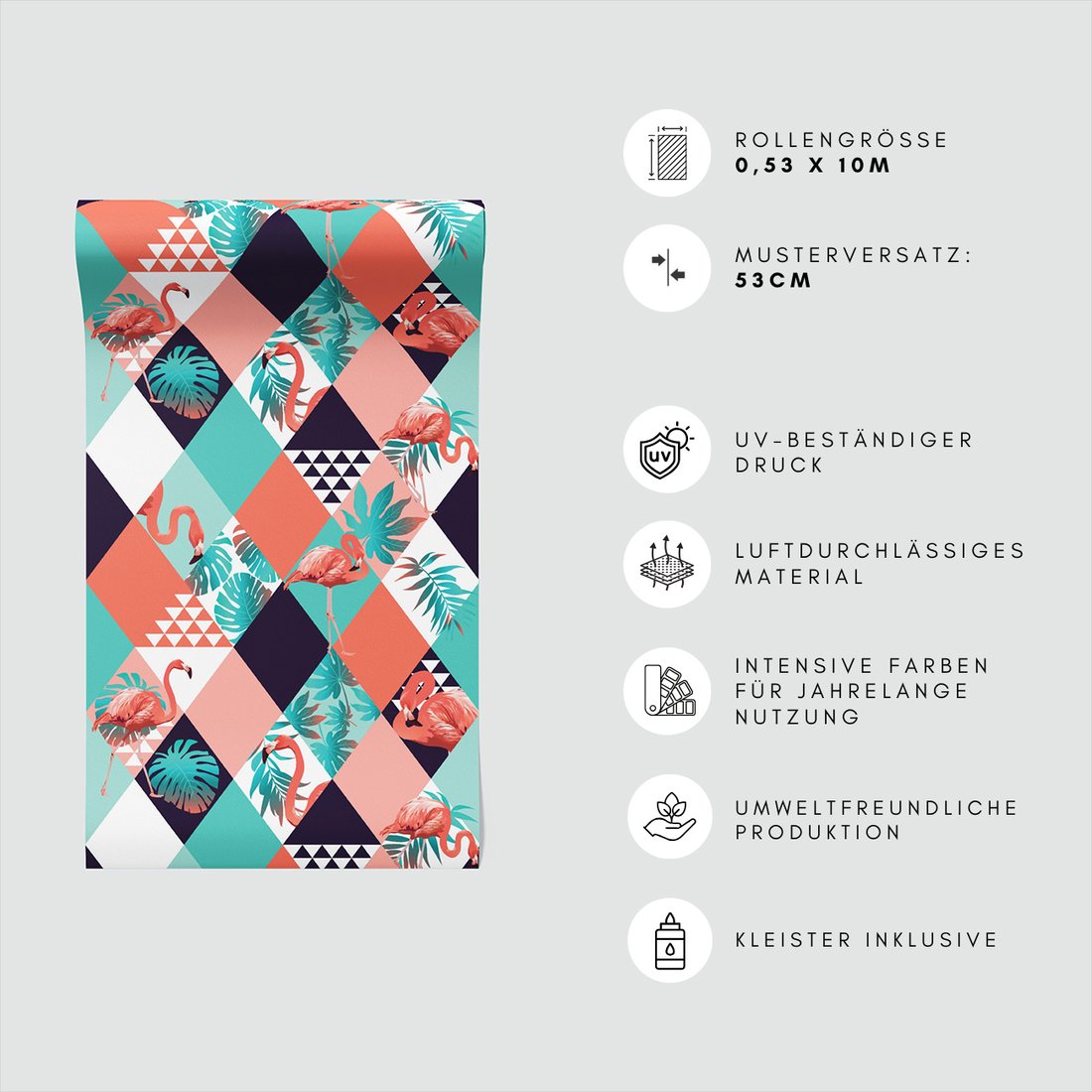 Odkryj piękno i funkcjonalność tapety z motywem flaming, liście, geometria. To połączenie wyjątkowego wzornictwa z łatwością aplikacji, doskonałe do każdego pomieszczenia.