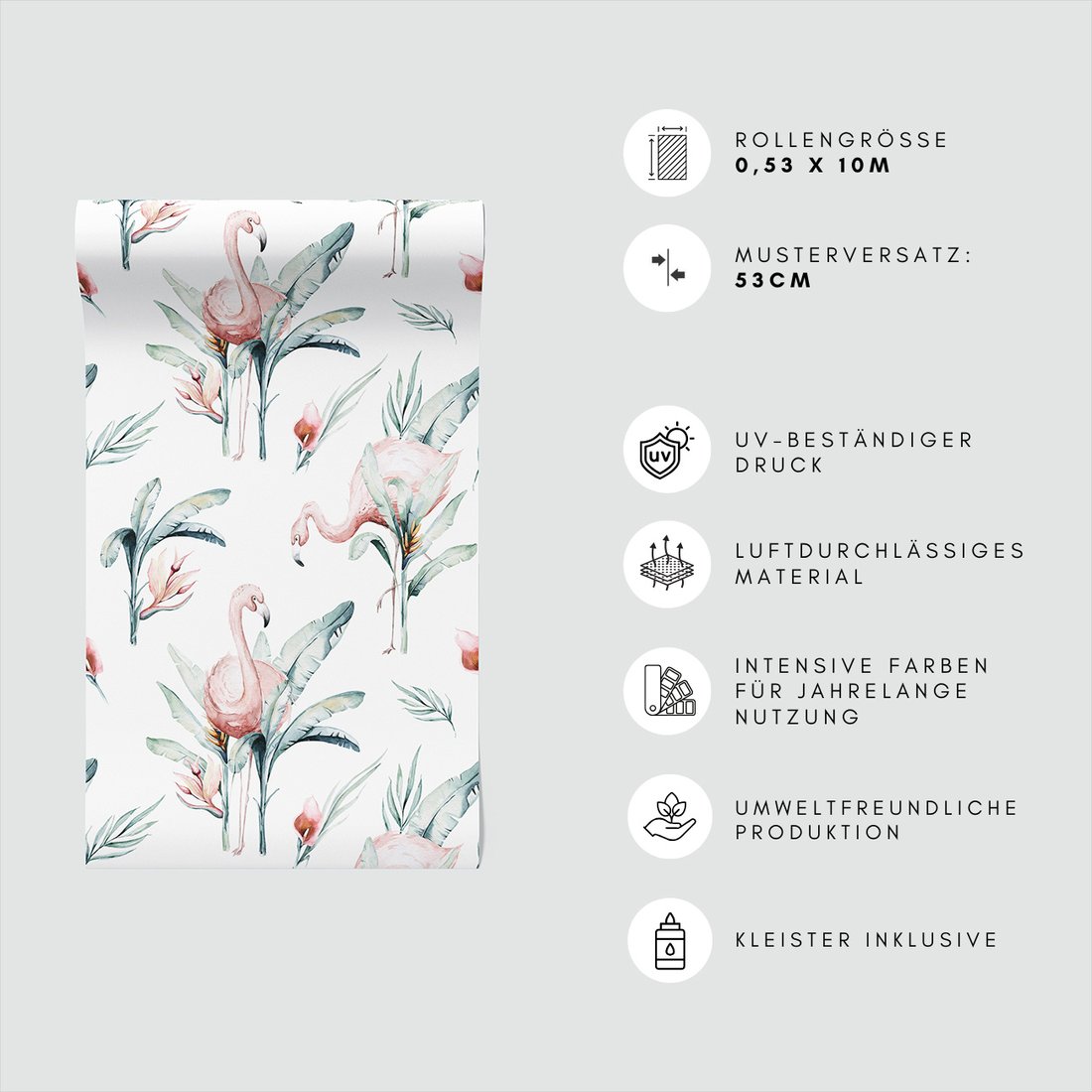 Odkryj piękno i funkcjonalność tapety z motywem flamingo, liście, kwiaty. To połączenie wyjątkowego wzornictwa z łatwością aplikacji, doskonałe do każdego pomieszczenia.