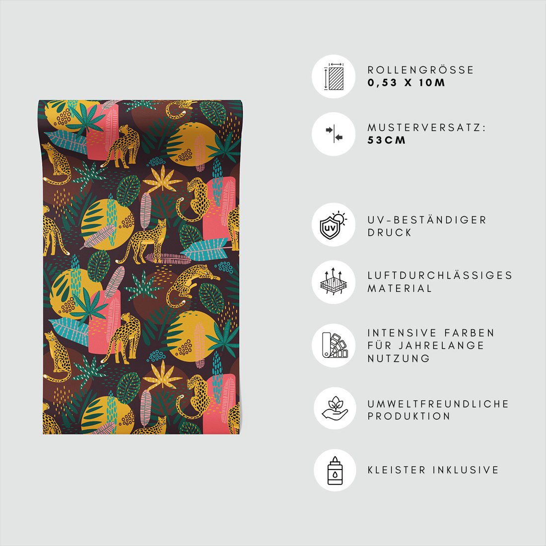 Odkryj piękno i funkcjonalność tapety z motywem liście, pantera, koła. To połączenie wyjątkowego wzornictwa z łatwością aplikacji, doskonałe do każdego pomieszczenia.