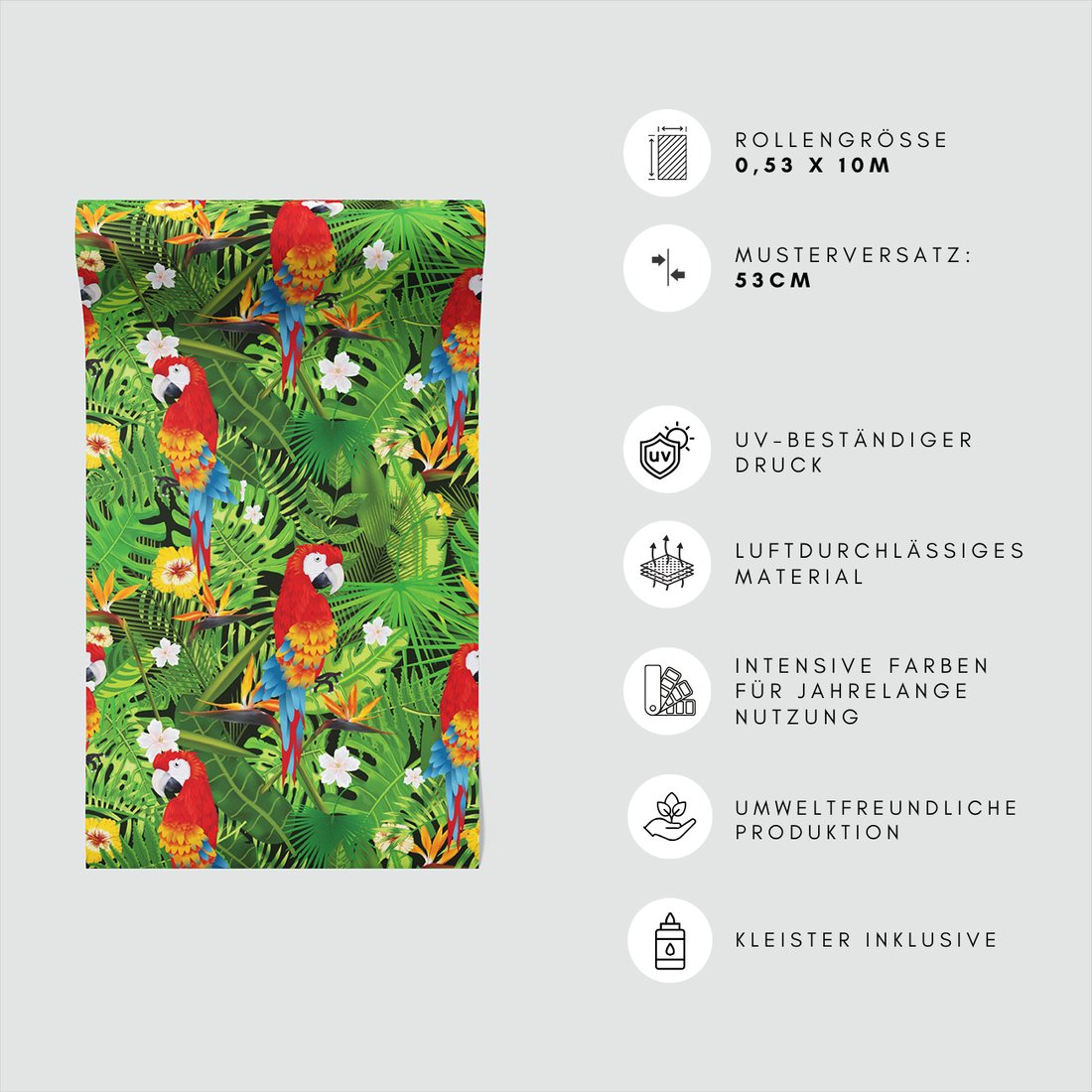 Odkryj piękno i funkcjonalność tapety z motywem papuga, liście, kwiaty. To połączenie wyjątkowego wzornictwa z łatwością aplikacji, doskonałe do każdego pomieszczenia.