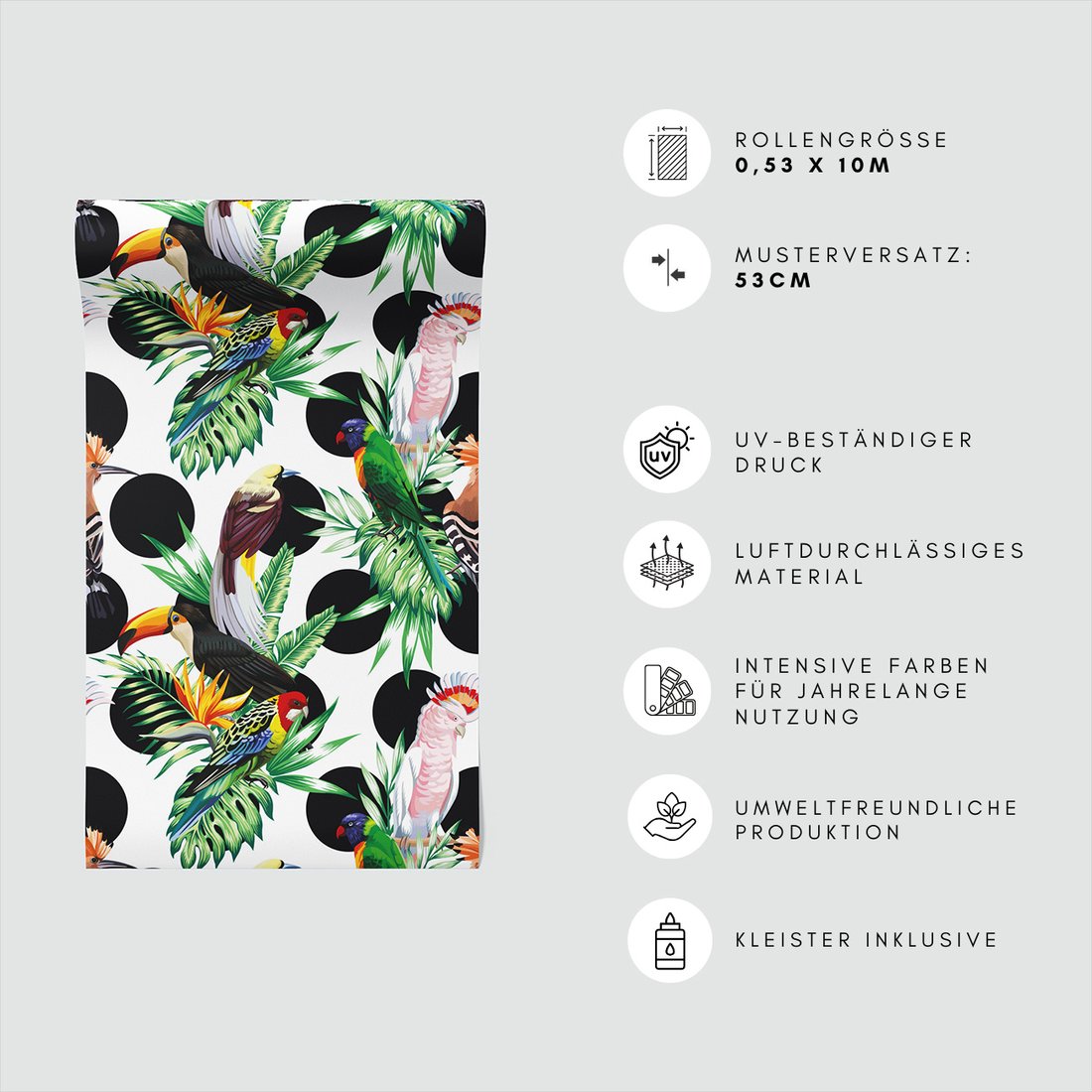 Odkryj piękno i funkcjonalność tapety z motywem papugi, liście, kropki. To połączenie wyjątkowego wzornictwa z łatwością aplikacji, doskonałe do każdego pomieszczenia.