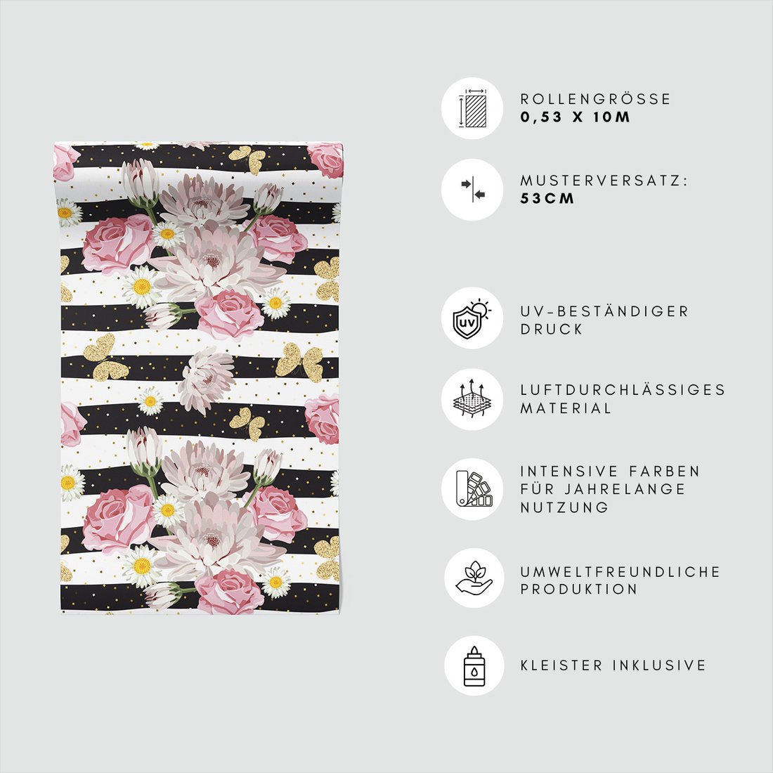 Odkryj piękno i funkcjonalność tapety z motywem róże, kwiaty, paski. To połączenie wyjątkowego wzornictwa z łatwością aplikacji, doskonałe do każdego pomieszczenia.